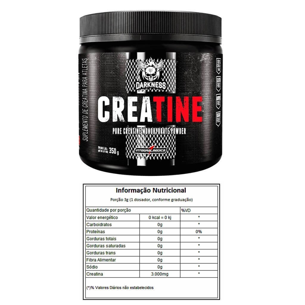 DESTAQUES - 100% Creatina - Sem aditivos artificiais - 0 g açúcares - 0 g sódio INFORMAÇÕES NUTRICIONAIS APRESENTAÇÃO: SUGESTÃO DE CONSUMO: Diluir 3,0 g de Creatine Darkness (1 dosador, conforme graduação) em bebida de sua preferência. CONSERVAÇÃO: Conservar este produto ao abrigo de luz, calor e umidade. Este produto não substitui uma alimentação equilibrada e seu consumo deve ser orientado por nutricionista ou médico. Este produto não deve ser consumido por crianças, gestantes, idosos e portadores de enfermidades. INGREDIENTES: Creatina mono-hidratada NÃO CONTÉM GLÚTEN. O CONSUMO DE CREATINA ACIMA DE 3g AO DIA PODE SER PREJUDICIAL À SAÚDE.