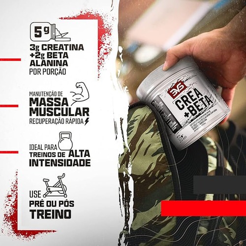 DESCRIÇÃO DO PRODUTO: Creatina e Beta Alanina são aminoácidos que juntos, agem otimizando a performance atlética e resistência muscular. A Creatina é o suplemento mais indicado na ciência para o aumento da força, hipertrofia e desempenho físico, pois atua como fonte de energia rápida para os músculos, sendo ideal para exercícios de alta intensidade e esforço. A Beta Alanina exerce uma potente ação antioxidante e contribui para a regulação do PH do tecido muscular, reduzindo a acidose, a fadiga e a queda do desempenho esportivo, assim proporcionando aumento da resistência muscular e treinos mais intensos por muito mais tempo. A Creatina fornece substrato para regenerar o ATP molécular de energia muscular, permitindo treinos mais intensos e com maior volume. A Beta Alanina eleva os níveis de carnosina intramuscular, substância que modula o pH das células musculares, combatendo a fadiga muscular e melhorando o desempenho. PORQUE USAR CREA + BETA 3VS NUTRITION? • Zero Açúcar - Zero Carboirato - Zero Sódio; • Desenvolvido com Matéria-Prima Importada; • 3G de Creatina por dose; • 2G de Beta Alanina por dose; • 100% Puro; • 30 doses. INGREDIENTES: Creatina Monohidratada, Beta Alanina e antiumectante dioxído de silício. NÃO CONTÉM GLÚTEN. NÃO CONTÉM LACTOSE. ALÉRGICOS: PODE CONTER DERIVADOS DE LEITE, SOJA E OVO. SUGESTÃO DE USO: Diluir 5g (1 scoop) do produto em 150ml de água ou bebida de sua preferência. Consumir uma porção ao dia, ou conforme recomendação do nutricionista ou médico. Produto indicado para o grupo populacional com idade a partir de 19 anos. Não exceda a recomendação diária de consumo indicada na embalagem e mantenha fora do alcance de crianças. ESSE PRODUTO NÃO É UM MEDICAMENTO. Armazenamento: Conservar ao abrigo da luz, calor e umidade. Após aberto, consumir em até 60 dias. Lote e validade estão impressos na embalagem. INFORMAÇÃO NUTRICIONAL: Foto da informação nutricional no anúncio.