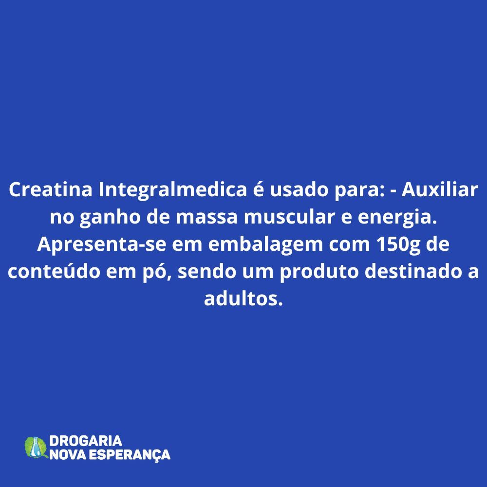 Creatina Integralmedica é usado para: - Auxiliar no ganho de massa muscular e energia. Apresenta-se em embalagem com 150g de conteúdo em pó, sendo um produto destinado a adultos.