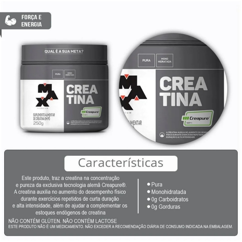 Sobre o Produto: A Creatina Creapure® 250g da Max Titanium é um suplemento de alta performance desenvolvido com creatina monohidratada de grau farmacêutico, reconhecida mundialmente pela sua pureza, qualidade e eficácia. Produzida na Alemanha pela AlzChem Trostberg GmbH, a marca Creapure® garante um produto livre de impurezas e substâncias indesejadas, ideal para atletas que buscam melhora no desempenho físico, força e recuperação muscular. A Max Titanium, referência em suplementação esportiva no Brasil, oferece esse suplemento em um pote com 250g de puro monohidrato de creatina, sem adição de outros ingredientes. Como Consumir - Consumir 3g (aproximadamente 1 dosador) ao dia, diluídos em 200 ml de água ou bebida de sua preferência. - Para melhores resultados, recomenda-se o uso contínuo e a orientação de um nutricionista ou profissional da saúde. - A creatina pode ser consumida em qualquer momento do dia, preferencialmente próximo aos treinos ou junto a refeições com carboidratos. Benefícios - Aumento da força e potência muscular - Melhora do desempenho em atividades de alta intensidade e curta duração - Auxilia na recuperação muscular entre os treinos - Aumento do volume muscular por retenção intracelular de água - Suplemento com selo de qualidade Creapure®, garantindo pureza superior - Livre de aditivos, corantes e conservantes Alergênicos - Não contém glúten. - Não contém lactose. - Produto livre de ingredientes alergênicos conforme RDC 26/2015. Ingredientes - Creatina monohidratada (Creapure®). - NÃO CONTÉM GLÚTEN. Advertências - Este produto não é um medicamento. - Não exceder a recomendação diária de consumo indicada na embalagem. - Manter fora do alcance de crianças. - Este suplemento deve ser consumido por adultos saudáveis, com acompanhamento de um profissional da saúde ou nutricionista. - Armazenar em local fresco, seco e ao abrigo da luz. - Após aberto, manter a embalagem bem fechada e consumir preferencialmente dentro do prazo de validade. Conclusão: A Creatina Creapure® da Max Titanium é a escolha ideal para quem busca desempenho, força e qualidade superior em suplementação. Com matéria-prima importada e selo de pureza Creapure®, oferece segurança, eficácia e confiança para atletas e praticantes de atividade física. Um suplemento puro, sem aditivos, que entrega o melhor da ciência esportiva para o seu treino.