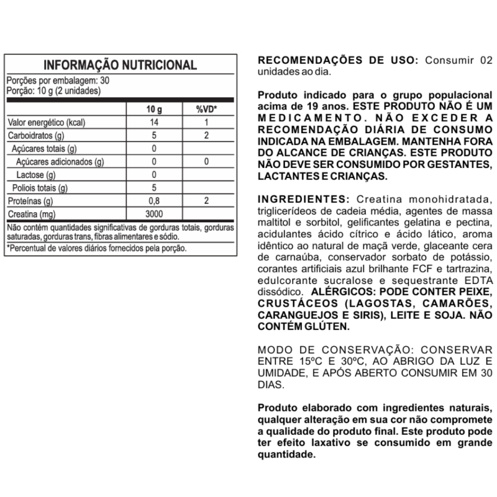 Descubra a nova maneira de turbinar seus treinos com as nossas gomas de creatina! Cada 2 Gummy contém 3g de creatina monohidratada, formulada para aumentar sua força, explosão e resistência. Com um sabor delicioso e uma textura irresistível, essas gomas são perfeitas para quem busca praticidade e eficiência na suplementação. --------------------- BENEFÍCIOS: --------------------- - Aumento de Força: Melhore seu desempenho em treinos intensos. - Recuperação Acelerada: Ajuda na recuperação muscular pós-treino. - Praticidade: Fácil de transportar e consumir a qualquer hora. - Sabor Irresistível: Uma forma deliciosa de complementar sua dieta. -------------------------------- SUGESTÃO DE USO: -------------------------------- Consuma 2 gomas por dia, antes ou após o treino, ou conforme orientação de um profissional. Experimente o sabor e a eficiência da creatina em formato Gummy e leve seus treinos a um novo nível! -------------------- Ingredientes: --------------------- - Maça Verde: Creatina monohidratada, triglicerídeos de cadeia média, agentes de massa maltitol e sorbitol, gelificantes gelatina e ectina, acidulantes ácido cítrico e ácido lático, aroma idêntico ao natural de maçã verde, glaceante cera de carnaúba, conservador sorbato de potássio, corantes artificiais azul brilhante FCF e tartrazina, edulcorante sucralose e sequestrante EDTA dissódico. - Frutas Vermelhas: Creatina monohidratada, triglicerídeos de cadeia média, agentes de massa xarope maltitol e xarope sorbitol, gelificantes gelatina e pectina, corante carmim, acidulantes ácido cítrico e ácido lático, aroma idêntico ao natural de frutas vermelhas, glaceante cera de carnaúba, conservador sorbato de potássio, edulcorante sucralose e sequestrante EDTAcálcio dissódico. ALÉRGICOS: PODE CONTER PEIXE, RUSTÁCEOS (LAGOSTAS, CAMARÕES, CARANGUEJOS E SIRIS), LEITE E SOJA. NÃO CONTÉM GLÚTEN.