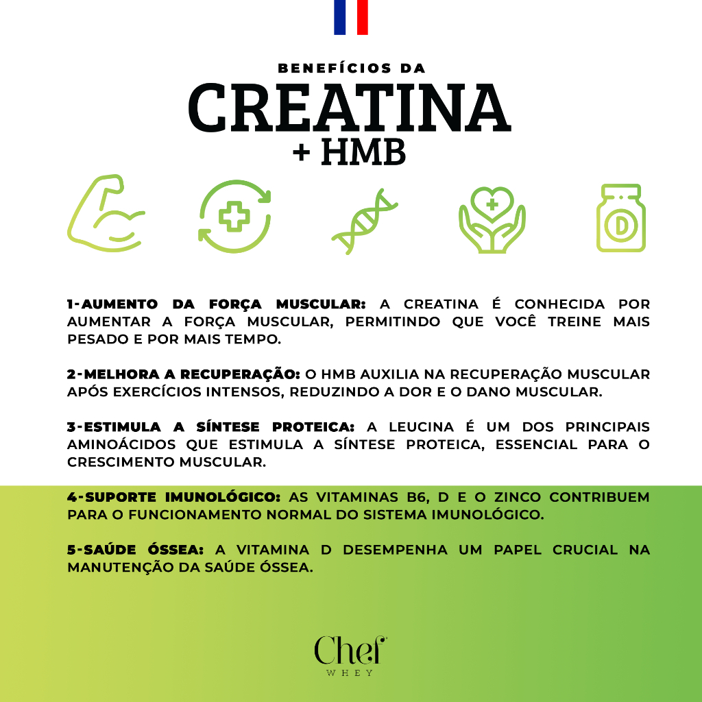 Creatina HMB® Créatine et HMB & Vitamina B6 300g - Chef Whey A Creatina HMB® Créatine et HMB & Vitamina B6 da Chef Whey é um suplemento inovador que combina os benefícios da creatina com o poderoso HMB (β-hidroxi β-metilbutirato) e a vitamina B6, oferecendo uma fórmula avançada para potencializar seus treinos, aumentar a força muscular e melhorar a recuperação. Ideal para atletas e entusiastas do fitness que buscam desempenho superior e resultados otimizados. Benefícios da Creatina HMB® Chef Whey: • Aumento da força e potência muscular, favorecendo treinos mais intensos. • Melhora na recuperação muscular, reduzindo danos e fadiga após o exercício. • Ação anticatabólica do HMB, ajudando a preservar a massa magra. • Apoio à síntese proteica, promovendo o ganho de massa muscular. • Suporte metabólico com vitamina B6, essencial para a produção de energia e função muscular. Diferenciais do Produto: • Combinação de creatina e HMB, proporcionando benefícios sinérgicos para desempenho e recuperação. • Fórmula enriquecida com vitamina B6, que auxilia no metabolismo energético e no equilíbrio hormonal. • Alta pureza e qualidade, garantindo melhor absorção e resultados mais rápidos. Indicações de Uso: • Pré e pós-treino: Para melhorar a performance e acelerar a recuperação muscular. • Indicado para atletas de alta performance ou praticantes de atividades físicas que buscam maximizar seus resultados. • Ideal para quem deseja aumentar a massa muscular, reduzir a fadiga e melhorar a resistência. Como usar: • Dissolva 1 scoop (5g) em 200-300ml de água ou bebida de sua preferência. Consuma diariamente, preferencialmente conforme orientação de um profissional de saúde. Destaques: • 300g de suplemento premium, com excelente rendimento. • Fórmula avançada, que une ciência e nutrição para potencializar seus resultados. • Sem adição de açúcares, adequado para diferentes tipos de dietas. A Creatina HMB® Créatine et HMB & Vitamina B6 - Chef Whey é o aliado perfeito para quem busca desempenho máximo, recuperação eficiente e ganho muscular consistente. Potencialize seus treinos e alcance novos patamares com essa fórmula revolucionária! 🏋️♂️💪