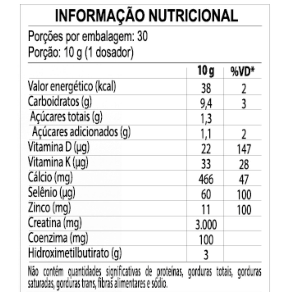 Sobre o produto: A Creatine HMB da Nutrify foi especialmente desenvolvida para pessoas acima de 40 anos, com o objetivo de preservar a massa muscular, fortalecer ossos e dentes, e otimizar o metabolismo energético. A fórmula combina creatina monohidratada e HMB, proporcionando uma suplementação que auxilia no aumento da força, recuperação muscular e desempenho físico. Com o enriquecimento de CoQ10, vitaminas e minerais essenciais, este suplemento oferece uma solução completa para quem busca mais vitalidade e disposição para viver com intensidade. Como consumir: Dilua 10 g (1 dosador) em 200 mL de água gelada e consuma uma vez ao dia ou conforme a orientação de um médico ou nutricionista. Benefícios - Preservação e Fortalecimento Muscular: A combinação de 3 g de creatina e 3 g de HMB ajuda a manter a massa magra e reduzir o catabolismo, promovendo músculos mais fortes e resistentes. - Aumento de Energia e Desempenho Físico: A fórmula enriquecida com CoQ10 e nutrientes essenciais melhora a produção de energia, otimizando a performance muscular e garantindo mais disposição ao longo do dia. - Fórmula Avançada: O HMB MAX e a creatina atuam de forma complementar, auxiliando no desempenho durante exercícios de alta intensidade e curta duração. - Foco no Público 40+: Ideal para adultos a partir dos 40 anos, promovendo mais saúde, força e confiança para o dia a dia. - Recuperação Muscular: A combinação de creatina e HMB contribui para uma recuperação mais rápida após treinos intensos, auxiliando na manutenção de uma rotina ativa e saudável. Alergênicos - Contém derivados de leite. - Pode conter traços de soja e glúten. Ingredientes: Hidroximetilbutirato de cálcio, creatina monohidratada, polpa de frutas vermelhas, concentrado de rabanete e cenoura, coenzima Q10, mix de vitaminas e minerais (bisglicinato de zinco, levedura enriquecida com selênio, menaquinona-7 e colecalciferol), aromatizantes, acidulante ácido cítrico, edulcorante glicosídeos de esteviol de Stevia rebaudiana Bertoni e regulador de acidez ácido málico (DL-). Advertências - Não exceder a dose recomendada. - Manter fora do alcance de crianças. - Gestantes, lactantes e pessoas com condições de saúde específicas devem consultar um médico antes de iniciar o uso do produto. - Este produto não substitui uma alimentação equilibrada. - Armazenar em local seco e fresco, ao abrigo da luz solar direta. Conclusão: A Creatine HMB da Nutrify é uma excelente opção para quem deseja melhorar a performance física, preservar a massa muscular e garantir mais energia para as atividades diárias. Especialmente formulada para adultos 40+, ela proporciona uma combinação eficaz de creatina e HMB, com nutrientes essenciais para fortalecer a musculatura e otimizar o desempenho, promovendo um envelhecimento mais saudável e ativo. Ideal para quem busca resultados superiores, tanto em treinos quanto no dia a dia.