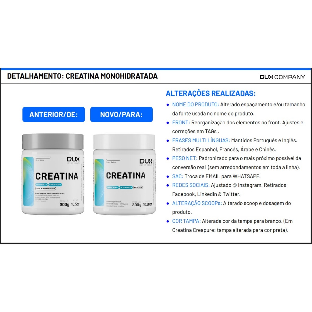 Bem-vindo à Da Fábrica Suplementos! ✔ Loja Oficial Shopee 🏆 ✔ Compra 100% assegurada e garantida ✅ ✔ Todos os produtos são 100% originais, lacrados e dentro da validade 📦 ✔ Acompanha Nota Fiscal para sua segurança 📜 ✔ Despachamos em até 24h úteis – Envio rápido e seguro! 🚀 ✔ Atendimento sempre disponível no chat para te ajudar! 💬 🔥 CREATINA MONOHIDRATADA 300g DUX HUMAN HEALTH | 100% PURA E MICRONIZADA! 🔥 A Creatina Monohidratada DUX é um suplemento de alto desempenho, desenvolvido para atletas e praticantes de atividades físicas que buscam aumento de força, resistência e recuperação muscular. Com pureza máxima, sem aditivos ou conservantes, ela garante melhor absorção e biodisponibilidade para potencializar seus treinos! ⚡ Benefícios da Creatina DUX: ✅ Aumento de força e potência muscular 💪 ✅ Melhora no desempenho físico em treinos intensos 🚀 ✅ Acelera a recuperação muscular pós-exercício 🏋️♂️ ✅ Auxilia no ganho de massa muscular e volume 💥 ✅ Micronizada para melhor absorção e dissolução 🔬 ✅ Produto 100% puro, sem aditivos, conservantes ou corantes ❌ 🥄 Como Tomar: Misture 3g (1 dosador) em água ou na bebida de sua preferência. Consuma diariamente, de preferência antes ou após os treinos, ou conforme orientação profissional. 📦 Embalagem: Pote com 300g, garantindo suplementação para até 100 doses! 🔥❓ PERGUNTAS FREQUENTES 🔹 A creatina DUX possui sabor? ✔️ Não! A creatina é 100% pura e sem sabor, podendo ser misturada em qualquer bebida. 🔹 Devo tomar creatina todos os dias? ✔️ Sim! Para melhores resultados, recomenda-se o consumo diário, independentemente de treinar ou não. 🔹 A creatina DUX causa retenção de líquido? ✔️ A creatina pode aumentar a hidratação muscular, mas isso não significa retenção de líquidos subcutânea, e sim um efeito positivo no aumento do volume muscular. 🔹 Essa creatina possui certificação de qualidade? ✔️ Sim! A creatina DUX segue os mais altos padrões de pureza e qualidade, garantindo segurança e eficácia. 🔎🔥 MÁXIMO DESEMPENHO COM CREATINA DUX! 🔥 Seja para hipertrofia, força, resistência ou recuperação, a Creatina DUX é sua aliada para resultados reais e duradouros! 🚀 Compre agora e leve sua performance para outro nível! 📦 Produto 100% original e envio imediato! 🔍 #creatinadux #creatina #creatinamonohidratada #forçamuscular #hipertrofia #suplementoparadesempenho #ganhodemassa #suplementação #duxhumanhealth #recuperaçãomuscular #preworkout #musculação