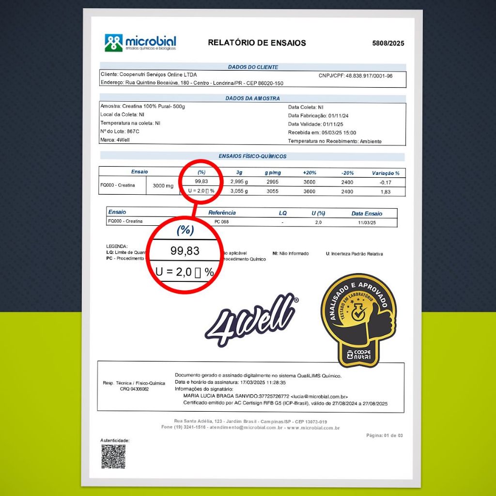 CREATINA COM LAUDO Ingredientes: Creatina Monihidratada. NÃO CONTÉM GLÚTEN. Acompanha Colher Dosadora Pacote de 1kg rende 333 Doses Pacote de 500g rende 166 Doses Creatina em Cápsula 4well 3g – 120 cápsulas Cada dose de 6 cápsulas fornece 3g de Creatina Monohidratada. Conteúdo: 120 cápsulas Porção/dose: 6 cápsulas Quantidade por dose: 3g de Creatina Monohidratada O QUE É CREATINA MONOHIDRATADA? A creatina é um derivado de aminoácidos obtida através da dieta de síntese por nosso próprio organismo. Ela está presente essencialmente no músculo e auxilia na manutenção dos níveis de energia durante períodos breves de exercício intenso. Ou seja, sua função é crucial nos treinos com muito peso na busca pelo ganho de massa. BENEFÍCIOS: •Aumenta a capacidade do músculo de gerar força •Aumento de massa magra •Aumento da capacidade de treinamento •Previne o catabolismo muscular QUANTO TOMAR/MELHOR HORÁRIO PARA CONSUMO O suplemento de creatina apresenta seus benefícios através de uso crônico, após iniciado o consumo ela deve ser ingerida todos os dias, levarão alguns dias até que os benefícios possam ser observados na sua totalidade. A Creatina é insulinodependente, isso significa que é preciso consumi-la junto com alimentos/suplementos que influenciem a produção de insulina. A lista de itens que possui este efeito envolve carboidratos de alto índice glicêmico como dextrose, maltodextrina, arroz, pão, macarrão e proteínas de alto índice insulinêmico como leite e whey protein. A sugestão de consumo determinada pela ANVISA é de 3gr ao dia. Não existe consenso entre pesquisadores sobre o melhor horário para consumo, existem evidencias que apontam para maiores benefícios quando consumida na refeição pré-treino, assim como também existem evidencias para melhores benefícios quando consumida junto com a refeição pós-treino. Modo de Preparo: Diluir 3g (1 colher dosadora) da creatina em 100ml de água ou bebida de sua preferência. Consumir uma porção ao dia ou conforme recomendação do nutricionista ou médico. Registro ISENTO conforme resolução RDC 27 de 06 de agosto de 2010 anexo I. Registro ISENTO conforme resolução RDC 240/2018.