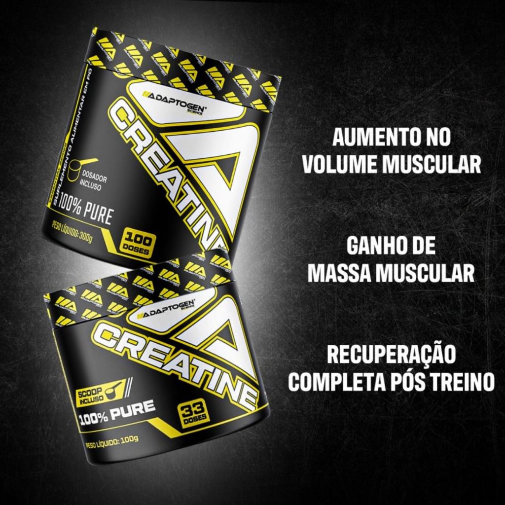 Creatina Platinum Series 300g A Creatina Platinum da Adaptogen é um suplemento de creatina monohidratada 100% pura, que melhora o desempenho físico, aumenta a força e resistência, e auxilia no ganho de massa muscular magra, especialmente em treinos intensos e de curta duração. Informações Nutricionais (porção de 3g): Creatina: 3000 mg Valor energético: 0 kcal Ingredientes: Creatina monohidratada. Não contém glúten. Modo de uso: Consumir 3g (1/2 dosador) diariamente, diluídos em água ou suco, preferencialmente pela manhã ou após o treino. Nos dias sem treino, recomenda-se o consumo após uma refeição. Observações: Produto indicado para adultos (acima de 19 anos). Não exceder a recomendação diária de consumo indicada na embalagem. Este produto não é um medicamento. Manter fora do alcance de crianças. A Creatina Platinum Series 300g é a escolha certa para quem busca resultados eficazes e qualidade comprovada em sua suplementação. Benefícios da Creatina: Aumento de Força Muscular A creatina melhora a capacidade dos músculos de gerar energia rápida (ATP), o que resulta em mais força e explosão durante os treinos intensos, como musculação ou esportes de alta intensidade. Ganho de Massa Muscular Ao permitir treinos mais pesados e intensos, a creatina favorece o crescimento da massa magra e ajuda a melhorar a composição corporal. Recuperação Acelerada Reduz o tempo de recuperação muscular após treinos exaustivos, diminuindo a dor muscular tardia (DOMS) e permitindo treinos mais frequentes e consistentes. Mais Energia e Desempenho A creatina ajuda a repor rapidamente os estoques de ATP (energia celular), proporcionando melhor desempenho em exercícios curtos e intensos, como sprints, saltos e levantamento de peso. Apoio Cognitivo Estudos indicam que a creatina também pode ter efeitos positivos no cérebro, como melhora na memória e raciocínio, especialmente em períodos de privação de sono ou estresse mental. Produto Puro e Seguro A creatina da Adaptogen é 100% monohidratada e pura, livre de glúten, com qualidade garantida e aprovada pela ANVISA Aminoácidos – unidades básicas das proteínas São “blocos de construção” que formam músculos, tecidos, enzimas e vários outros componentes do nosso corpo. A creatina é formada por três aminoácidos: Glicina Arginina Metionina O que é a Creatina da Adaptogen? A Creatina é um suplemento alimentar composto por creatina monohidratada pura, indicado para quem busca mais força, energia, desempenho e ganho de massa muscular. Desenvolvido para melhorar o desempenho físico, especialmente em atividades de curta duração e alta intensidade, como musculação, crossfit, corrida de explosão e esportes de força. Aumento de força e potência muscular Ganho de massa magra Melhora na performance esportiva Recuperação muscular mais rápida Ela fornece energia extra para os músculos através da reposição de ATP (trifosfato de adenosina), a principal fonte de energia celular utilizada em atividades explosivas. Para que serve a Creatina? A sua principal função é aumentar a força, resistência e o desempenho físico em treinos intensos e de curta duração. Aumenta a energia muscular ao regenerar rapidamente o ATP (fonte imediata de energia das células) Melhora a performance em treinos de força, explosão e velocidade Favorece o ganho de massa muscular magra Acelera a recuperação entre séries e treinos Contribui para maior volume muscular, por aumentar a retenção de água intracelular Ideal para: Atletas e praticantes de musculação Esportes de alta intensidade e curta duração (como crossfit, futebol, lutas) Fases de ganho de massa ou melhora de performance Creatina é desempenho puro. Mais força. Mais evolução. Mais resultado. Vantagens da Creatina Adaptogen: 100% Creatina Monohidratada Pura – máxima eficiência, absorção e segurança comprovada Aumenta força, energia e massa muscular Melhora a recuperação pós-treino É pura, segura, sem glúten e aprovada pela ANVISA Ótimo custo-benefício Diferenças do Creatina para outras variedades A Creatina Monohidratada da Adaptogen se destaca por ser eficaz, segura, acessível e amplamente estudada. Além de superar a monohidratada em relação ao custo-benefício e comprovação científica. Tipo de Creatina Absorção Retenção Hídrica Custo Destaques Creatina Monohidratada (Adaptogen) Boa Moderada Baixo Mais estudada, ótimo custo-benefício Micronizada Boa Moderada Médio Dissolve melhor, efeito semelhante Kre-Alkalyn Ótima Baixa Alto Melhor absorção, sem saturação HCL Muito alta Baixa Alto Menor dose, ideal para digestão Blend Variável Variável Alto Mistura de diferentes tipos Por Que Escolher a Creatina da Adaptogen? Porque você merece um suplemento puro, potente e confiável para alcançar seus melhores resultados! Máxima absorção Mais força, mais performance – energia rápida para treinos intensos e explosivos Qualidade testada e aprovada, com padrão internacional Excelente custo-benefício Combi