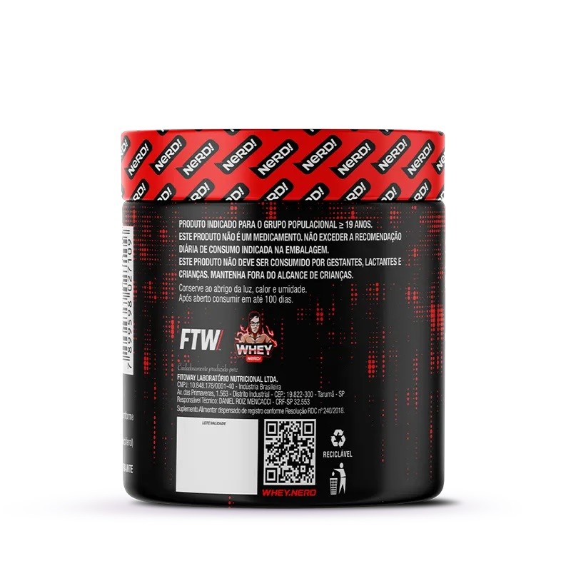 Creatina Monohidratada Whey Nerd é um suplemento alimentar desenvolvido para complementar a ingestão de creatina, um composto naturalmente presente no organismo, e vitaminas D e K. Indicado para adultos com estilo de vida ativo. Produto destinado à complementação nutricional de creatina, conforme recomendação de profissional de saúde, associado a uma alimentação equilibrada. INGREDIENTES: Creatina micronizada monohidratada, vitamina D (colecalciferol) e vitamina K (fitomenadiona). NÃO CONTÉM GLÚTEN. ITENS INCLUSOS: - Pote com 300g - Porção: 3g (½ medida dosadora) - Rendimento: Cerca de 100 porções. COMO CONSUMIR: - Diluir ½ medida dosadora (3g) em 200ml de água ou outra bebida de sua preferência. Consumir conforme orientação profissional. INFORMAÇÕES ADICIONAIS: - Produto indicado para maiores de 19 anos; - Este produto não deve ser consumido por gestantes, lactantes ou crianças; - Mantenha fora do alcance de crianças; - Não exceder a recomendação diária de consumo indicada na embalagem; - Conservar em local seco e fresco, ao abrigo da luz e umidade; - Após aberto consumir em até 100 dias; - Este produto não é um medicamento. CERTIFICAÇÃO Suplemento alimentar dispensado de registro conforme Resolução RDC nº 240/2018. Alegações baseadas no Anexo V da IN 28 Anvisa.