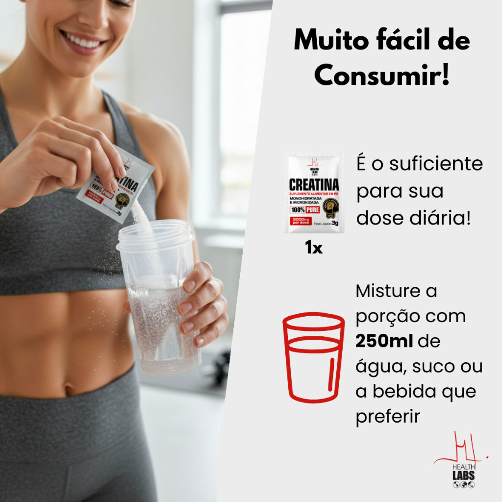 A Creatina Monohidratada Pura Health Labs é um suplemento alimentar essencial para quem busca otimizar o desempenho físico. Apresentada em um prático formato de $30$ sachês individuais de $3 \text{g}$ (totalizando $90 \text{g}$), garante a dose exata e a conveniência para ser consumida em qualquer lugar. 🔬 Informações Científicas e Funcionalidade A creatina é amplamente estudada e reconhecida por seu papel na bioenergética muscular. Ela atua como um potente precursor na ressíntese de ATP (Adenosina Trifosfato), a principal fonte de energia para atividades explosivas e de alta intensidade. A suplementação contínua está associada à: Otimização de Desempenho: Suporte energético em séries de exercícios de curta duração e alta potência. Hidratação Intracelular: Contribui para a entrada de água nas células musculares. Recuperação: Apoia a regeneração dos estoques energéticos pós-esforço. Qualidade Garantida: Produto $100\%$ Monohidratado, puro e livre de aditivos desnecessários. 📝 Informações e Modo de Uso Este suplemento contém exclusivamente Creatina Monohidratada e é isento de glúten. A dose sugerida é de 1 sachê ($3 \text{g}$) por dia. Para o consumo, dissolva o conteúdo do sachê em aproximadamente $200 \text{ml}$ de água ou sua bebida de preferência. O uso da creatina deve ser contínuo e diário, independentemente da realização do treino no dia. 📜 Ingredientes Creatina Monohidratada. NÃO CONTÉM GLÚTEN. 🚨 Cuidados Essenciais (Avisos Legais Padrão) Este produto é um suplemento alimentar e não substitui uma alimentação equilibrada. Não exceder a recomendação diária de consumo indicada. Produto recomendado para adultos acima de 19 anos. Não deve ser consumido por gestantes, lactantes e crianças. Pessoas com condições de saúde específicas (incluindo problemas renais) devem procurar orientação de médico ou nutricionista antes de consumir. Mantenha em local seco, arejado, ao abrigo da luz e fora do alcance de crianças. Consumir em até $30$ dias após a abertura da embalagem.