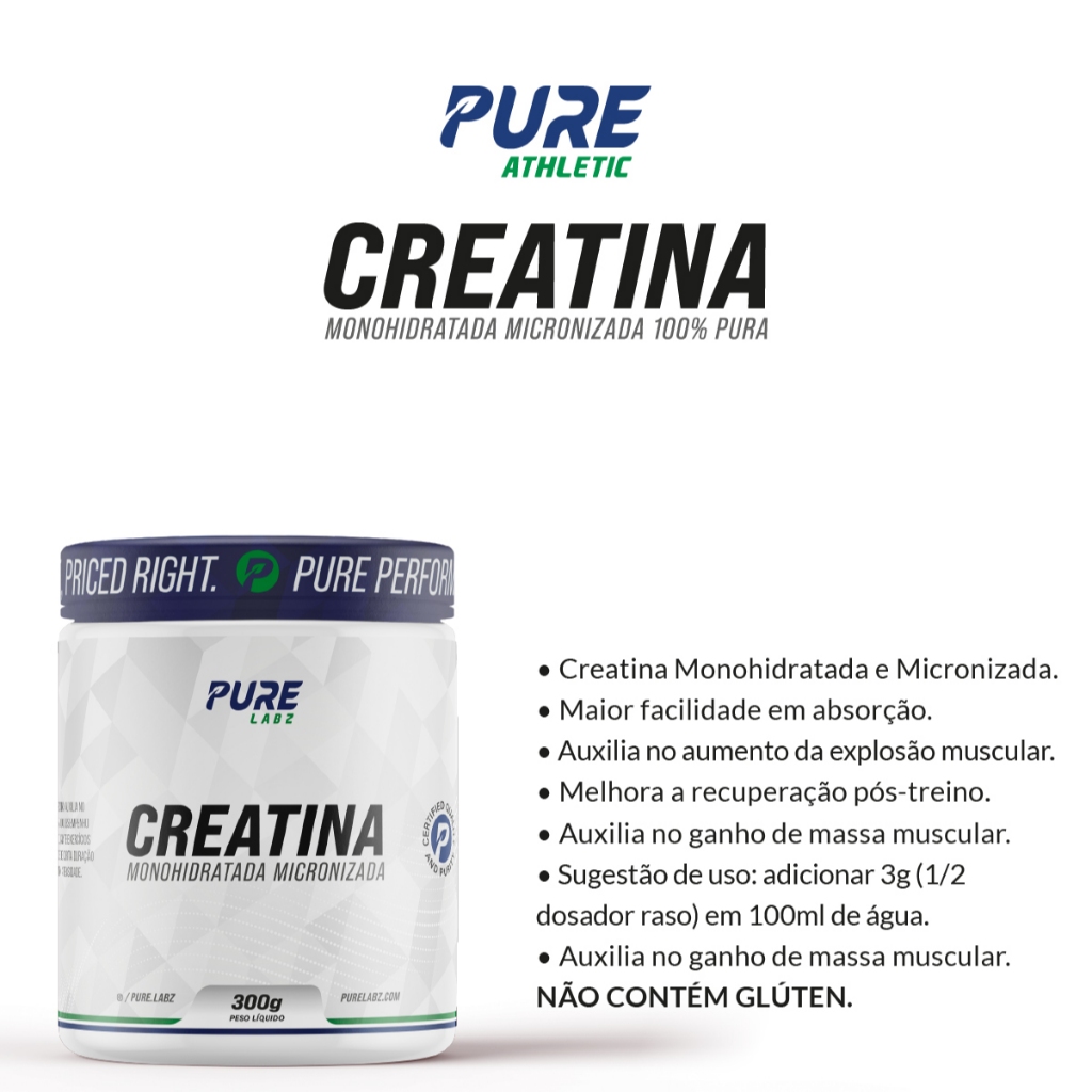 Creatina Monohidratada Pura 300g Pure Athletic 🔥 Bem-vindo à Vita Shopping, o seu destino de saúde e performance! Trabalhamos com suplementos de alto padrão, com garantia de procedência, segurança na compra e os lançamentos que você procura. Mais que uma loja, somos seu parceiro de resultados. Descrição do produto: A Creatina Pura é o suplemento ideal para quem busca mais força, explosão muscular e recuperação acelerada. Com 100% de creatina monohidratada de alta qualidade, ela auxilia no aumento do desempenho nos treinos, melhora a resistência e contribui para o ganho de massa muscular. Informações Técnicas: Marca: Pure Athletic Formato do Suplemento: Pó Gramagem: 300g Peso da Porção: 3g Formato de Venda: Unidade Tipo de Embalagem: Pote Ingredientes: Creatina Monohidratada Não contém Glutén BENEFÍCIOS: A suplementação da creatina proporciona a recuperação mais rápida da molécula de energia (ATP) durante o momento de pausa das atividades de alta intensidade, esta recuperação auxilia no aumento do desempenho durante a sessão de treinamento, diminuindo a fadiga muscular, aumentando a força e a potência em exercícios anaeróbios, com isso, a creatina auxilia nos resultados finais como o aumento de massa muscular. Aumento do volume muscular; Aumento de força; Aumento de energia; Evita a fadiga muscular. Recomendado se seu objetivo é: ganho de massa muscular; melhorar a performance. SUGESTÃO DE USO: Dissolver 3g do produto em 200ml de água e consumir 30 minutos antes da atividade física. Conteúdo da embalagem: Creatina Monohidratada Pura 300g Pure Athletic