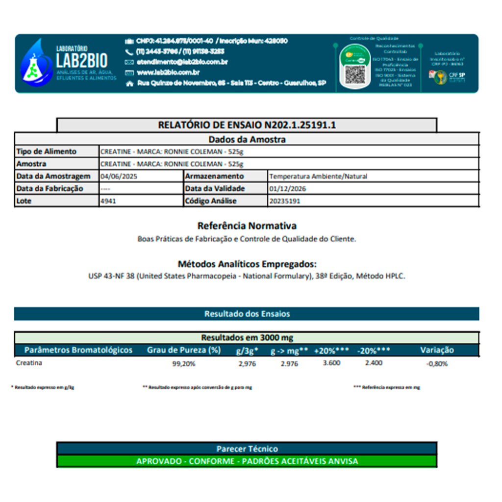 VALIDADE: 12/2026 * Compre Com Segurança produto Original Importado * Estoque no BRASIL Pronta Entrega * Loja Autorizada e Credenciada * Nota fiscal Ronnie Coleman e sua marca Ronnie Coleman 100% Pura 525g. Ronnie Coleman Signature Series Creatine - XS, creatina Monohidratada em pó, recuperação pós-treino para construção e força muscular, suporte energético, ganhador de massa, sem sabor, 175 porções CREATINA 100% PURA: Cada colher contém 3g de creatina, 0 carboidratos, 0 calorias e não tem sabor para misturar facilmente com água, misturar em um shake de proteína. INGREDIENTES DE ALTA QUALIDADE: Todos os nossos ingredientes têm uma finalidade, são da mais alta qualidade. Utilizamos apenas instalações de fabricação que seguem as diretrizes e regulamentos mais rígidos estabelecidos por certificações. ATRASA A FADIGA AUXILIA A RECUPERAÇÃO APOIA O CRESCIMENTO MUSCULAR Nenhum outro ingrediente de suplemento foi testado com tanta frequência com um resultado comum: ele constrói músculos, Zero preenchimentos, Novidade da série de assinaturas de Ronnie Coleman. Ronnie Coleman Signature Series marca importada, esta em 121 paises, instalações de fabricação certificadas e usa ingredientes que passam por rigorosos controles de qualidade, até chegar ao produto pronto para consumir. Além disso, eles têm certificações internacionais de autenticidade, que garantem ainda mais sua excelência. Uma nutrição equilibrada tem um papel muito importante na qualidade de vida. Com o ritmo acelerado de muitas pessoas, às vezes, é muito difícil prestar atenção a todos os requisitos que o corpo precisa para estar saudável e forte. Neste sentido, os suplementos cumprem a função de complementar a alimentação e ajudam a obter as vitaminas, minerais, proteínas e outros componentes indispensáveis para o correto funcionamento do organismo. Esse tipo de suplemento ajuda a complementar a alimentação de pessoas com objetivos ou requisitos nutricionais específicos. Seu consumo pode ser indicado por vários fatores, como a duração e a intensidade da atividade física, o tipo de esporte, o ambiente em que é praticado, a idade, a composição corporal, o peso, etc. É importante destacar que seu uso deve ser acompanhado por uma alimentação equilibrada e hábitos de vida saudáveis. VALIDADE: 12/2026 *Este produto é um suplemento dietético, não é um medicamento. Suplementa Ante dietas insuficientes. Consulte seu médico e / ou farmacêutico.