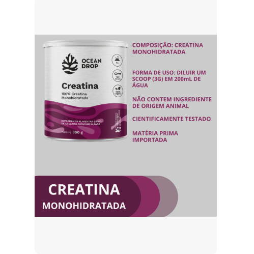 Creatina Monohidratada Ocean Drop – 300g Suplemento alimentar 100 por cento puro, vegano, sem glúten e sem lactose. Contém creatina monohidratada com alto grau de pureza, ideal para quem busca performance, força e recuperação muscular. Benefícios Aumenta força e potência muscular Auxilia no ganho de massa magra Melhora a performance em treinos intensos Favorece a recuperação pós-treino Contribui para mais energia e disposição Produto sem açúcar, sem aditivos artificiais Composição por porção (3g) Creatina monohidratada pura, dióxido de silício como antiumectante. Sugestão de uso Consumir 3g ao dia, diluídos em água ou bebida de sua preferência. O uso pode ser feito antes ou após o treino, ou conforme orientação profissional. Diferenciais Ocean Drop Creatina com pureza garantida de até 99,9 por cento Vegano, sem glúten, sem lactose Embalagem econômica com 300g – até 100 porções Sem corantes, conservantes ou ingredientes artificiais Clean label: apenas o essencial para resultados reais Recomendações Armazenar em local seco, fresco e protegido da luz Não exceder a dose recomendada Manter fora do alcance de crianças Suplemento indicado para adultos saudáveis Em caso de gestação, amamentação ou condição clínica, consulte um profissional da saúde Garantia do vendedor: 7 dias