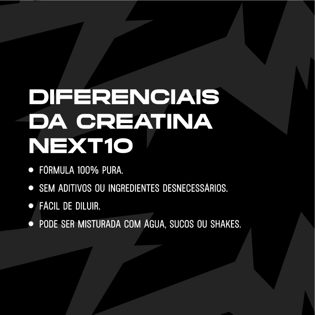 Creatina Monohidratada Next10 – Potencialize seus Treinos como Nunca! NEXT10: A marca de suplemento do Neymar Jr. chegou para você! Mais força, mais energia, mais resultados! Se você quer superar seus limites e alcançar a máxima performance, a Creatina Monohidratada 100% Pura da Next10 é a escolha certa. AUMENTE SUA ENERGIA E RESISTÊNCIA: A creatina auxilia na rápida regeneração de ATP, garantindo energia extra para exercícios de alta intensidade. Isso significa mais disposição e melhores resultados nos seus treinos, seja na musculação, no futebol, na corrida ou em qualquer outro esporte. FORÇA E PERFORMANCE EM CADA REPETIÇÃO: Com um impulso extra de energia, você sente o aumento da força muscular e melhora sua explosão, permitindo levantar mais carga e treinar com mais intensidade. RECUPERAÇÃO MUSCULAR ACELERADA: Menos fadiga, mais rendimento. A creatina auxilia na recuperação muscular, reduzindo o tempo entre os treinos e evitando aquele cansaço prolongado. GANHO E MANUTENÇÃO DE MASSA MUSCULAR: A creatina potencializa o crescimento da massa muscular magra, ajudando você a alcançar um físico mais definido e forte. FÓRMULA PURA E DE ALTA QUALIDADE: 100% Creatina Monohidratada – sem aditivos, sem misturas, apenas o que seu corpo precisa. Sem glúten, sem lactose, sem açúcar. Qualidade premium para máxima absorção e resultados reais. COMO USAR? Dilua 1 colher de café em água, suco ou sua bebida favorita uma vez ao dia ou conforme orientação profissional. IMPORTANTE: Produto indicado para atletas e praticantes de atividades físicas. Não recomendado para gestantes, lactantes e crianças. O consumo deve estar aliado a uma alimentação equilibrada e orientação de um profissional. Garanta já a sua Creatina Next10 e leve seus treinos para outro nível!