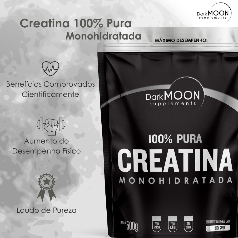 Creatina 100% Pura Monohidratada - Darkmoon Supplements Fácil de Tomar: Nossa creatina monohidratada em pó se dissolve instantaneamente em líquidos, proporcionando uma forma conveniente e eficaz de suplementação. INGREDIENTES: Creatina monohidratada micronizada. APRESENTAÇÃO: Pote com 300g Como tomar a Creatina Darkmoon: Diluir 1/2 (meio) scoop dosador de Creatina Darkmoon em 200ml de água, suco ou qualquer outra bebida de sua preferência. Benefícios: A Creatina Darkmoon auxilia no aumento do desempenho físico durante exercícios repetidos de curta duração e alta intensidade. Composta por creatina monohidratada e micronizada 100% pura. Excelente custo benefício; Isento de conservantes.
