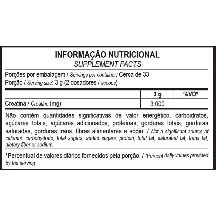 Sobre o Produto Creatina é um produto destinado a complementar os estoques endógenos de creatina. Uma porção de 3,0g do produto (2 dosadores) contém 3,0g de creatina. A creatina auxilia no aumento do desempenho físico durante exercícios repetidos de curta duração e alta intensidade. Destaques LACTOSE: Não contém. Recomendação de uso Consumir uma porção ao dia. Ingredientes Creatina monohidratada antiumectante dióxido de silício. NÃO CONTÉM GLÚTEN. Advertências Este produto não é medica- mento. Não exceder a recomenda- ção diária de consumo indi- cada na embalagem. Mantenha fora do alcance de crianças. Modo de Preparo Diluir 3,0g (2 dosadores) do produto em água ou bebida preferida. Benefícios A creatina auxilia no aumento do desempenho físico durante exercícios repetidos de curta duração e alta intensidade. Trata-se de um produto destinado a complementar os estoques endógenos de creatina. Alergênicos Pode conter derivados de leite, de ovo e de soja.