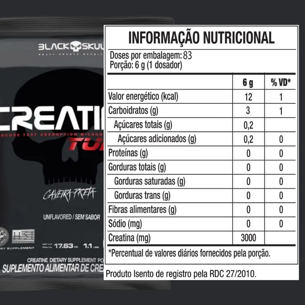 CREATINA TURBO™ – CAVEIRA PRETA SERIES™ Força, energia e performance em uma única dose. A Creatina Turbo™ da linha Caveira Preta Series™ é um suplemento avançado, desenvolvido para quem busca aumento de força, desempenho esportivo e suporte anabólico com base científica. Sua fórmula une dois ingredientes altamente eficazes: creatina monohidratada e maltodextrina, otimizando o transporte e a absorção da creatina para os músculos. Por que Creatina com Carboidrato? - A creatina é um dos compostos mais estudados na nutrição esportiva, conhecida por sua capacidade de: - Aumentar os estoques de fosfocreatina muscular; - Melhorar a força e resistência em treinos intensos; - Reduzir a demanda cerebral por oxigênio, com benefícios cognitivos e anti-inflamatórios (1). - Ao ser combinada com carboidratos como a maltodextrina, há um aumento da insulina, o que potencializa o transporte da creatina para dentro das células musculares e aumenta também os níveis de glicogênio (2), fundamentais para a recuperação e performance. Composição por dose: - 3g de Creatina Monohidratada - Maltodextrina como fonte energética - Apenas 12 calorias por porção Modo de consumo recomendado: - Diluir 1 ¼ colher de chá (6g) em 150 ml de água. Consumir uma vez ao dia, preferencialmente após o treino ou conforme orientação profissional. Recomendações importantes: - Produto destinado a adultos acima de 19 anos; - Consumir logo após o preparo; - Armazenar em local seco, ao abrigo da luz; - Consumir até 30 dias após romper o lacre interno. Ingredientes: - Creatina Monohidratada, Maltodextrina. ALÉRGICOS: Pode conter leite, ovo, amendoim, soja, trigo e derivados. NÃO CONTÉM LACTOSE. NÃO CONTÉM GLÚTEN.