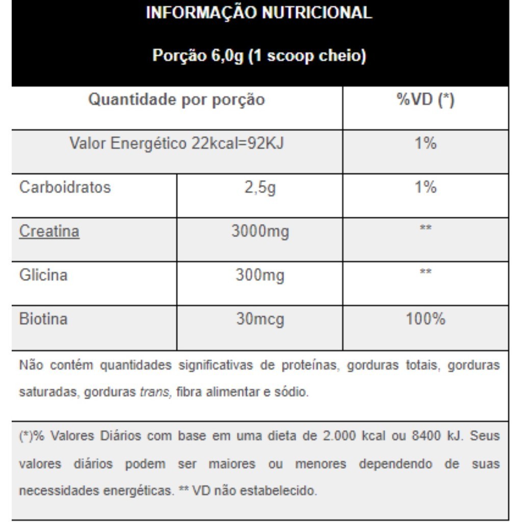 Creatine Double Force Pote 300g Bodyaction Sobre o produto A Creatina Double Force 300g é um suplemento que combina Creatina Monohidratada, Isomaltulose (Palatinose), Glicina e Biotina. Essa combinação exclusiva promove uma absorção eficaz da creatina, aumentando a força muscular e melhorando o desempenho durante exercícios de alta intensidade. Além disso, a presença de Isomaltulose e Biotina auxilia na recuperação muscular após treinos intensos. O produto é indicado para maiores de 19 anos e pode ser consumido uma vez ao dia, diluído em água ou outra bebida de preferência. Recomendação de uso • Recomenda-se consumir uma porção uma vez ao dia, ou conforme orientação do nutricionista ou médico. Benefícios: • Aumento da força muscular • Eficiência na absorção • Recuperação muscular • Aprimoramento da performance física Modo de Preparo • Dilua 6g (1 scoop cheio) do produto em 200ml (1 copo) de água ou em sua bebida favorita. Advertências • Consulte um profissional de saúde antes de usar. • Não exceda a dose recomendada. • Mantenha fora do alcance das crianças. • Armazene em local fresco e seco. • Este produto não substitui uma alimentação equilibrada. • Interrompa o uso em caso de reações adversas. Alergênicos • O produto Creatina Double Force 300g não contém glúten, mas pode conter derivados do leite, devido ao processo de fabricação em equipamentos que também processam esses alimentos. Ingredientes • Creatina Monohidratada, Isomaltulose (Palatinose), Glicina e Biotina (D-Biotina).