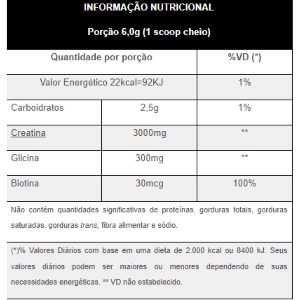 Creatine Double Force 150g Bodyaction Sobre o produto: A Creatine Double Force da Bodyaction é um suplemento avançado que combina Creatina Monohidratada com Isomaltulose (Palatinose), Glicina e Biotina. Essa fórmula exclusiva foi desenvolvida para potencializar os efeitos da creatina, promovendo maior força, desempenho físico e recuperação muscular após exercícios intensos. O diferencial está na presença da Glicina, que potencializa a ação da creatina, e da Isomaltulose + Biotina, que favorecem a absorção do composto e a recuperação da função muscular. A Creatine Double Force é ideal para atletas que buscam um suporte mais eficaz durante treinos de alta intensidade. Como consumir: Diluir 6g (1 scoop cheio) em 200 ml de água ou bebida de sua preferência. Consumir uma vez ao dia ou conforme recomendação de nutricionista ou médico. Benefícios: - Auxilia no aumento do desempenho físico em exercícios intensos e curtos - Fórmula com CREA-ATP (Creatina + Glicina) para maior eficácia - Isomaltulose e Biotina que favorecem a absorção e recuperação muscular - Pode contribuir para o aumento da força e resistência - Ideal para atletas e praticantes de atividades físicas regulares - Não contém glúten Alergênicos: Pode conter derivados do leite.* *Produzido em equipamento onde se processam leite e derivados. A fabricante adota medidas preventivas para evitar contaminação cruzada. Ingredientes: Creatina Monohidratada, Isomaltulose (Palatinose), Glicina e Biotina (D-Biotina). Não contém glúten. Advertências: - Este produto não é um medicamento. - Não exceder a recomendação diária de consumo indicada na embalagem. - Mantenha fora do alcance de crianças. - Este produto não deve ser consumido por gestantes, lactantes e crianças. - Indicado para maiores de 19 anos. Conclusão: A Creatine Double Force da Bodyaction é uma solução completa para quem busca desempenho superior, com foco em força, recuperação e absorção otimizada. Sua composição exclusiva com ingredientes funcionais oferece resultados mais eficazes e consistentes, ideal para quem leva o treino a sério e quer extrair o máximo da suplementação com creatina.