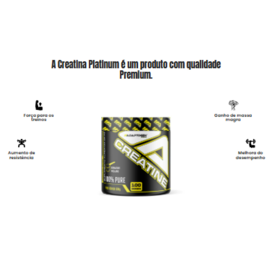 A Creatina Platinum é um suplemento essencial para os praticantes de atividades físicas que buscam o ganho de massa muscular. Além de auxiliar no aumento de força, aumentar a resistência anaeróbia, reduz o dano muscular e a dor causada por exercícios. Benefícios: - Auxilia no ganho de força - Reposição dos níveis de ATP - Mais explosão e resistência ao esforço físico - Auxilia no ganho de massa muscular - Melhora de performance - Hipertrofia muscular Creatina 100% Pura Adaptogen A Creatina é um dos suplementos alimentares com mais estudos comprovando sua eficácia. Ela é um aminoácido de origem animal, mas que também é produzida pelo nosso próprio corpo. A função da Creatina é regenerar o ATP, que é a principal fonte de energia do nosso corpo. Portanto, quando há o estoque de Creatina em nosso organismo, conseguimos manter o exercício por mais tempo, além de puxar mais carga, isto é, a Creatina te proporciona maior força e resistência. Como tomar Creatina? Sempre recomendamos a consulta a profissional de nutrição. Porém, de acordo com a ANVISA, o recomendável é a ingestão diária de 3g, visto que nosso corpo já produz 2g. No pré-treino, ela te ajudará com força e resistência. Já no pós-treino, a Creatina auxiliará na recuperação muscular. A Creatina Platinum é um produto com qualidade premium, aprovado pela ANVISA e entrega 100% do que está no rótulo. Todos os produtos da Adaptogen Science passam por rigorosos testes antes de serem distribuídos, prática que faz com que os consumidores confiem e atestem a qualidade dos suplementos que estão consumindo.