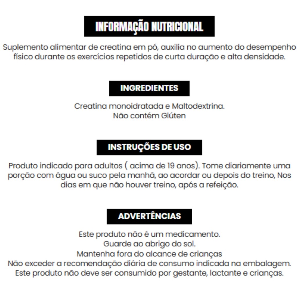 A Creatina é um dos suplementos alimentares com mais estudos comprovando sua eficácia. Ela é um aminoácido de origem animal, mas que também é produzida pelo nosso próprio corpo.A função da Creatina é regenerar o ATP, a principal fonte de energia do nosso corpo. Portanto, quando há o estoque de Creatina em nosso organismo, conseguimos manter o exercício por mais tempo, além de puxar mais carga, isto é, a Creatina te proporciona maior força e resistência. Além disso, ela é usada para preservar a massa muscular de idosos e prevenir doenças como o Alzeheimer e o Parkinson.A nova Creatine Super contém carboidrato que aumentará absorção da substância, porque a liberação de insulina no sangue desempenha um papel vital no transporte de creatina para as células musculares, promovendo a síntese de proteínas.Qual é a diferença da nova Creatine Super para as creatinas monoidratada comuns? A Creatina Nova Creatine Super contém 3,0g de carboidratos e as demais não possui carboidratos, por isso ela transporta facilmente pelo os músculos.A nova Creatine Super da Adaptogen é um produto com qualidade aprovada pela ANVISA e entrega 100% do que está no rótulo. Todos os produtos da Adaptogen Science passam por rigorosos testes antes de serem distribuídos, prática que faz com que os consumidores confiem e atestem a qualidade dos suplementos que estão consumindo.INGREDIENTESCreatina monoidratada e Maltodextrina.Não contém GlútenINSTRUÇÕES DE USOProduto indicado para adultos ( acima de 19 anos). Tome diariamente uma porção com água ou suco pela manhã, ao acordar ou depois do treino, Nos dias em que não houver treino, após a refeição.ADVERTÊNCIASEste produto não é um medicamento.Guarde ao abrigo do sol.Mantenha fora do alcance de criançasNão exceder a recomendação diária de consumo indicada na embalagem.Este produto não deve ser consumido por gestante, lactante e crianças.