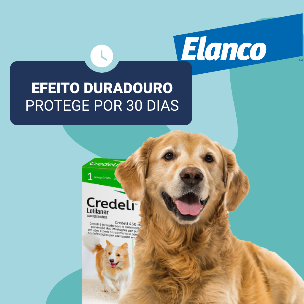 Credeli 450 mg é um suplemento de uso veterinário desenvolvido para cães com peso entre 11 e 22 kg. Sua fórmula age rapidamente contra pulgas e carrapatos, com efeito prolongado de até 30 dias. Comprimido mastigável palatável, facilita a administração e promove conforto para o pet. Indicado para manutenção da saúde dermatológica e controle de parasitas externos, é ideal em rotinas preventivas sob orientação profissional. FICHA TÉCNICA Marca: Elanco Produto: Credeli 450 mg Indicação: Cães de 11 kg a 22 kg Apresentação: 1 comprimido mastigável Composição: Lotilaner Ação: Controle de pulgas e carrapatos Administração: Via oral conforme orientação veterinária CUIDADOS COM O PRODUTO Utilize de acordo com orientação veterinária Armazene em local fresco, seco e protegido da luz Evite contato direto com mucosas ou olhos Mantenha fora do alcance de crianças e animais não indicados Suspender o uso e buscar orientação profissional caso haja reações