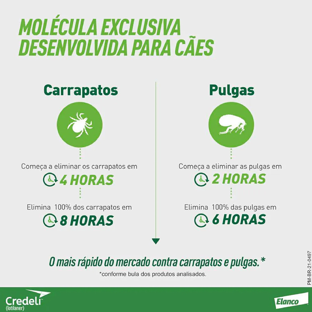 O mais rápido do mercado contra carrapatos e pulgas. Credeli é um comprimido mastigável, pequeno e saboroso, que atua rapidamente para proteger cães filhotes e adultos contra carrapatos e pulgas. Conforme bula dos produtos analisados: Por que Credeli é o mais rápido? Molécula própria desenvolvida para cães com essa finalidade. Carrapatos: Começa a eliminar em até 4 horas. Elimina 100% dos carrapatos em 8 horas. Pulgas: Começa a eliminas em até 2 horas Elimina 100% das pulgas em 6 horas. Cada embalagem contem 3 comprimidos, um para cada mês. 90 dias de proteção Credeli combate o amblyomma cajennense Além de ser o mais rápido do mercado, sua formula exclusiva também combate o Amblyomma Cajennense, mais conhecido como carrapato-estrela, causador da febre maculosa. PARA UMA DIVERSIDADE DE RAÇAS E TAMANHOS Credeli possui 100% de aceitação em 70 raças de cães, incluindo raças TOY, como Chihuahua e Yorkshire Terrier Tamanho e dosagem? Com um sabor que os cães adoram. Credeli possui principio ativo extra purificado que poupa o fígado e seguro para: Cães a partir de 1,3 Kg até 45Kg - filhotes de 8 semanas ou mais.