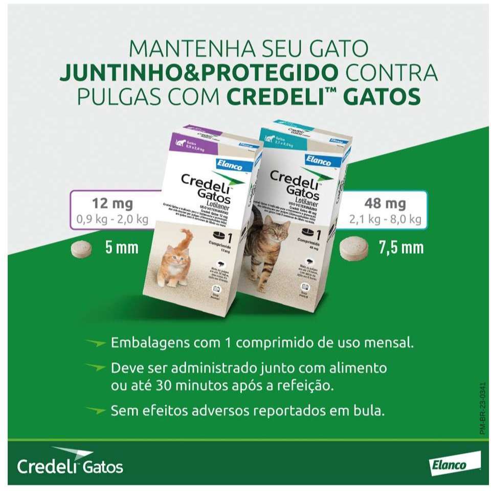 🐾 Credeli Original – Antipulgas e Carrapatos para Cães e Gatos (Elanco) Proteja seu pet com Credeli, o antipulgas e carrapatos de uso oral desenvolvido pela Elanco. Rápido, seguro e eficaz, Credeli começa a agir em apenas 2 horas, eliminando pulgas e carrapatos e mantendo seu animal protegido por 30 dias. ✅ Vantagens do Credeli Elimina pulgas e carrapatos rapidamente Proteção mensal e contínua Fácil de administrar (comprimido mastigável sabor carne) Indicado para cães e gatos de todos os tamanhos Produto original Elanco, com garantia de procedência Seguro para uso a partir de 8 semanas de idade 🐶 Versões disponíveis para CÃES Credeli 56 mg – até 2,5 kg Credeli 112 mg – 2,5 a 5,5 kg Credeli 225 mg – 5,5 a 11 kg Credeli 450 mg – 11 a 22 kg Credeli 900 mg – 22 a 45 kg Credeli 1400 mg – 45 a 65 kg 🐱 Versões disponíveis para GATOS Credeli 12 mg – até 2 kg Credeli 48 mg – acima de 2,1 kg 💊 Modo de uso Administre 1 comprimido via oral junto com a refeição do animal. Repita a dose a cada 30 dias para manter a proteção contínua. ⚠️ Atenção Consulte sempre um médico-veterinário antes do uso. Produto de uso veterinário. Armazenar em local seco e fresco. Credeli ou Credeli Plus – Qual escolher? A versão Credeli (normal) oferece proteção eficaz contra pulgas e carrapatos, sendo ideal para a maioria dos pets. Já o Credeli Plus combina duas substâncias (Lotilaner + Milbemicina Oxima), oferecendo proteção ampliada, que além de pulgas e carrapatos também combate vermes intestinais e a dirofilariose (verme do coração). Ambas as versões são de uso mensal, seguras e com sabor agradável. 👉 Escolha o Credeli Plus se quiser uma proteção mais completa; 👉 Escolha o Credeli tradicional se o foco for antipulgas e carrapatos.