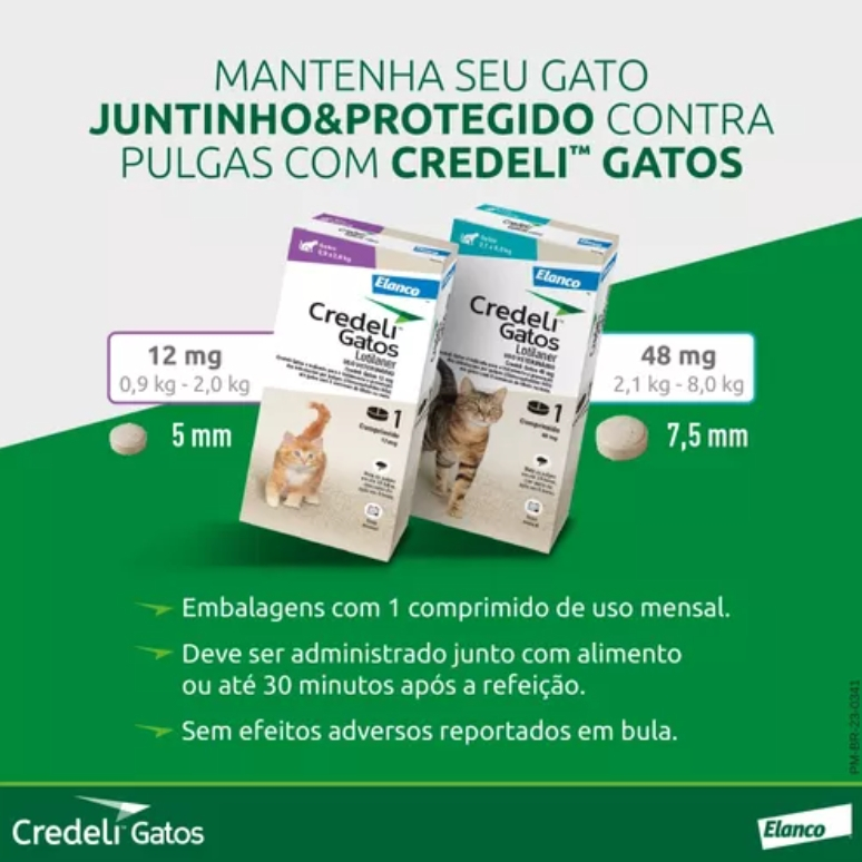 PRODUTO ORIGINAL COM NOTA FISCAL! - - - - - DESCRIÇÃO: Credeli Gatos é um comprimido mensal, pequeno e saboroso que atua rapidamente no tratamento e prevenção de infestações causadas por pulgas (Ctenocephalides felis) em gatos. É seguro para gatos adultos e filhotes a partir de 8 semanas de idade e peso mínimo de 900 gramas. Ganhador do Easy to Give Award, concedido pela Sociedade Internacional de Medicina Felina, em reconhecimento aos esforços de empresas farmacêuticas em garantir produtos que facilitam a aceitação e administração em gatos. - - - - - MODO DE USO: Administrar 1 comprimido uma vez ao mês periodicamente durante ou 30 minutos após a refeição. - - - - - Enviamos o seu pedido o quanto antes possível! Obrigado pela preferência.