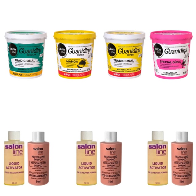 Salon Line Guanidina Tradicional Super Base relaxante para cabelos de espessura grossa ou resistente. Salon Line Guanidina Tradicional Super Base Relaxante reduz o volume, solta os fios e proporciona efeito liso saudável. A Base Relaxante Guanidina Tradicional Super Salon Line foi criada para usar junto com o líquido ativador com Guanidina. Alinha, hidrata e disciplina o cabelo, além de deixar um brilho maravilhoso. Sua textura desliza e se espalha facilmente sobre os fios, o que garante um resultado mais homogêneo. Ação Lanolina: hidrata, umecta e confere emoliência aos fios. Como Usar Salon Line Guanidina Tradicional Super Conselho de Aplicação 1 - Passe a Keratin Hair Food sobre testa, orelhas e por toda a região do couro cabeludo para evitar o contato do creme com a pele; 2 - Com o cabelo desembaraçado, divida-o em quatro partes com prendedores não metálicos, ou mais, caso tenha experiência no processo de relaxamento; 3 - Com um pente de dente fino, inicie a aplicação pela nuca. Distribua o produto em mechas finas da raiz até a metade do cabelo, mantendo a distância de 0,5 cm do couro cabeludo. Não tracione a raiz. Prossiga a aplicação por todo o cabelo. Não o prenda com presilhas durante esse processo; 4 - Ao terminar a aplicação, volta para onde começou e, com um pente de dentes médios, aplique o produto do comprimento às pontas. Prossiga até passar por todo o cabelo. Não o prenda com presilhas durante esse processo; 5 - Deixe o produto de acordo com o tempo indicado no seu teste de mecha. O tempo esteja acabando e você ainda não terminou de aplicar o creme em todas divisões, volte à primeira parte e já enxague. Caso contrário, o resultado pode ficar diferente do esperado; 6 - Enxágue o cabelo completamente com água morna ou temperatura ambiente. Evite a região dos olhos enquanto enxagua. Enxágue três (3) vezes seguindo o mesmo processo de APLICAÇÃO com duração de três (3) a quatro (4) minutos por parte, certificando-se de que o relaxamento saiu. Use o shampoo neutralizante com indicador de cor para a remoção total de resíduos, também irá alertá-lo do local onde o relaxamento não foi retirado completamente. Verifique a cor do shampoo para saber onde ainda se encontram resíduos de produto no cabelo. Lave o cabelo até que a espuma esteja completamente branca; 7 - Por último, aplique um condicionador de sua preferência. Finalize como desejar; Retoque de raiz: Recomendamos o prazo mínimo para retoque de 90 dias. Aplique apenas na parte que cresceu do cabelo, respeitando a distância de 0,5 cm da raiz.