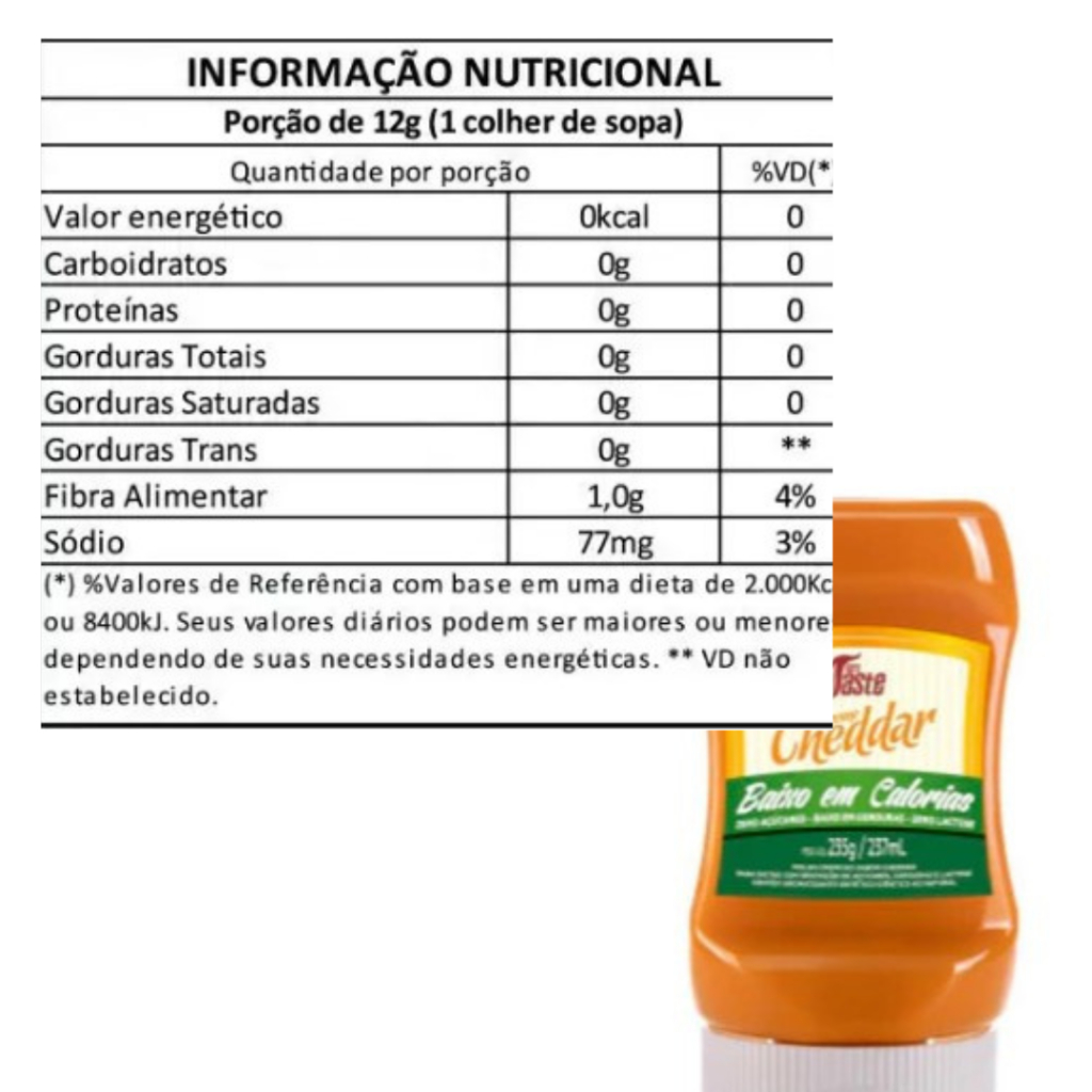 Benefícios: Sem Glúten, Sem Óleo de Palma, Zero Açúcar, Baixo em Calorias, Baixo em Gordura, Zero Lactose. O Creme Cheddar Mrs Taste é um produto único e totalmente inovador no mercado, para substituição do queijo comum. Ele possui todo o sabor do queijo, sendo Baixo em calorias, Baixo em gorduras e com um teor de sódio abaixo de um queijo comum. SAL ROSA DO HIMALAIA: O Cremes de Queijo Mrs Taste são adicionados de Sal Rosa do Himalaia, que contém os mesmos 84 minerais e elementos que são encontrados no corpo humano, que por si só é bastante impressionante! Alguns destes minerais incluem: o cloreto de sódio, sulfato de cálcio, potássio e magnésio. Ingredientes: Água, polidextrose, queijos variados em pó, leite em pó desnatado, amido de batata modificado, sal rosa do Himalaia, lactase, espessantes: goma guar, celulose microcristalina e carboximetilcelulose, acidulante ácido lático, conservadores sorbato de potássio e benzoato de sódio, aromatizante, corante natural caramelo e edulcorante natural stevia. Mudança na rotulagem nutricional Informamos que passamos recentemente por uma mudança na rotulagem nutricional nos produtos da Mrs. Taste devido às novas legislações RDC Nº 429/20 e IN Nº75/20 da ANVISA. Portanto, os lotes mais recentes estão com diferentes caracterizações.