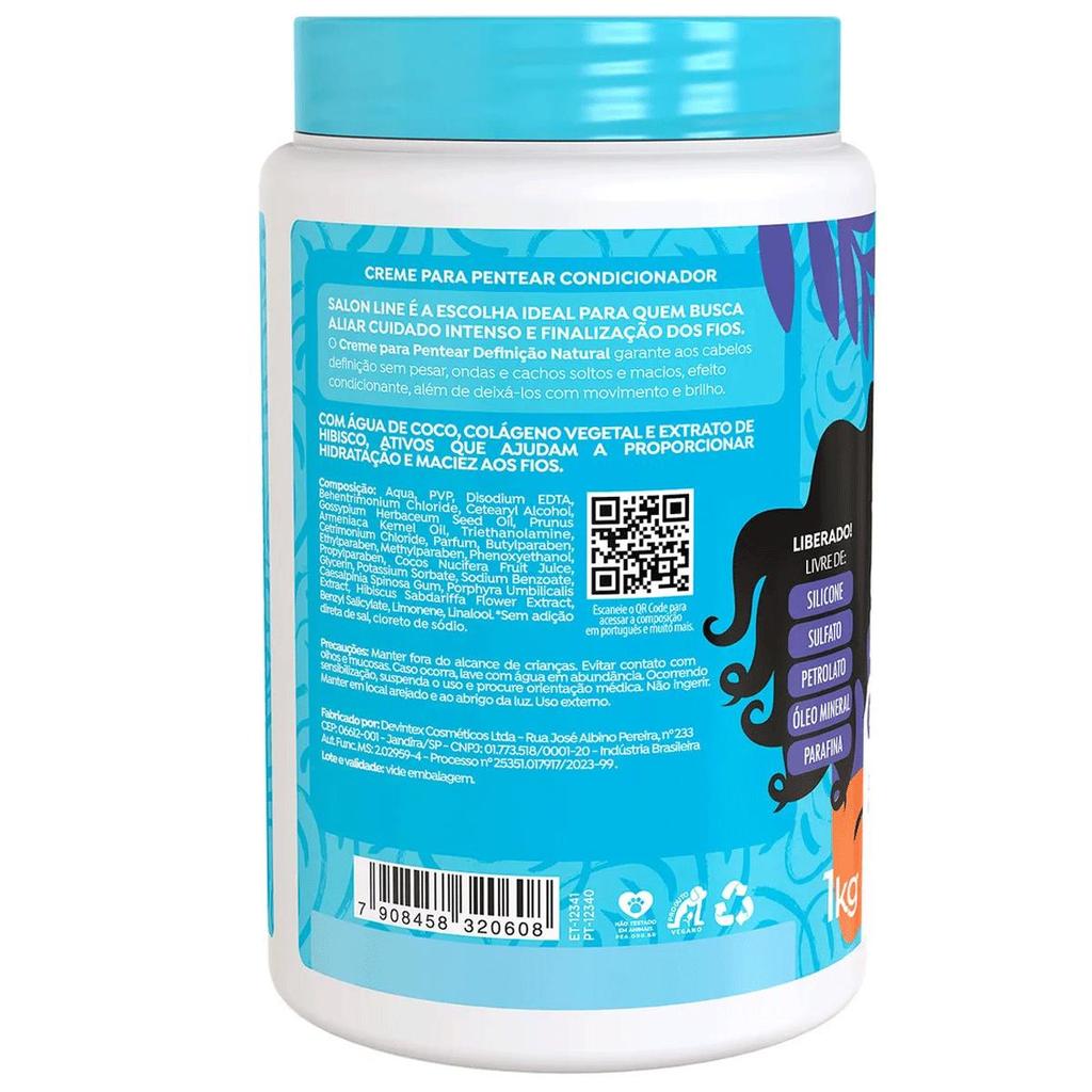 O Creme de Pentear Salon Line Definição Natural 1kg foi desenvolvido especialmente para quem deseja cabelos ondulados e cacheados com definição leve, natural e duradoura. Sua fórmula inovadora garante hidratação profunda sem pesar os fios, proporcionando um visual com movimento, maciez e brilho intenso. Ideal para uso diário, ele facilita o desembaraço, deixando os fios mais maleáveis e com acabamento impecável. Com textura leve e ação nutritiva, o creme envolve cada fio desde a raiz até as pontas, controlando o frizz e mantendo a forma natural dos cachos por muito mais tempo. Perfeito para quem busca uma finalização suave e natural, sem rigidez ou resíduos. Além disso, o produto é vegano, livre de parabenos e ingredientes de origem animal, unindo performance e cuidado consciente. Características principais: Definição natural sem pesar os fios Hidratação leve e duradoura para ondas e cachos Desembaraço fácil, reduzindo a quebra durante o pentear Controle do frizz e brilho radiante Textura leve com acabamento natural Fórmula vegana, livre de parabenos e ingredientes de origem animal Ideal para cabelos ondulados e cacheados