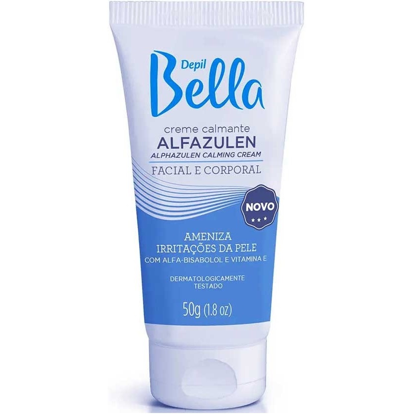 Creme Calmante Alfazulen 50g - Depil Bella O Azuleno é extraído da flor da camomila e possui propriedades calmantes, sendo ideal para suavizar a pele depois da depilação tanto facial como corporal, ele ameniza irritações e regenera rapidamente a pele depilada. Modo de Usar: Aplique uma fina camada sobre a pele, no local onde foi depilado. Precauções: uso externo. Mantenha fora do alcance de crianças. Evite contato com os olhos. Havendo irritação suspenda o uso e procure orientação médica. Aut. Func. MS: 2.04504.4/ Processo Nº: 25351.091111/2015-49
