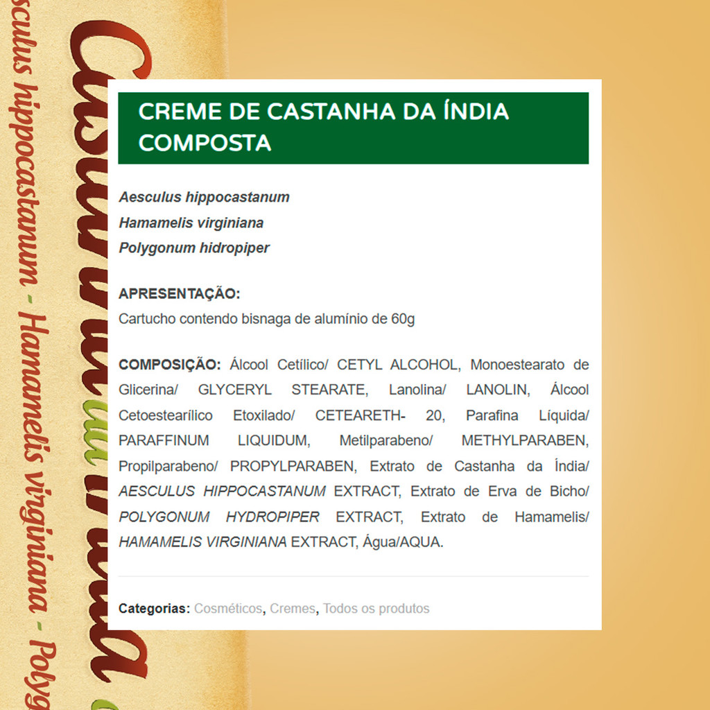 CASTANHA DA INDIA CREME 60 GRS Produto para o corpo. O Creme de castanha da Índia composta é um creme de textura suave e de fácil aplicação. Possui características hidratantes e adstringentes, podendo ser aplicado em todo o corpo. É Composto com os extratos naturais de Castanha da Índia (Aesculus hippocastanum), Hamamelis (Hamamelis virginiana) e Erva de Bicho (Polygonum hidropiper).