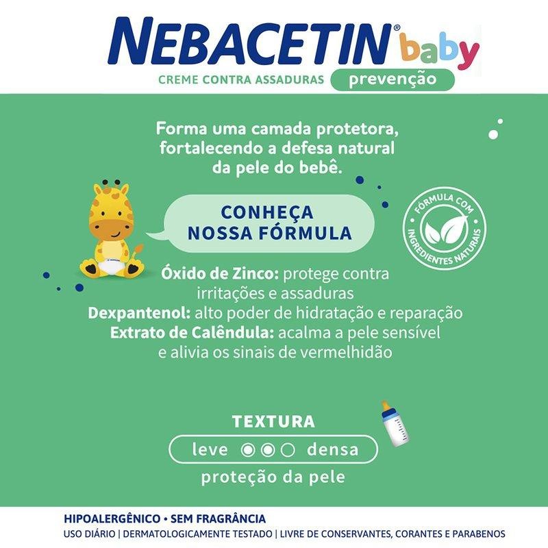 Creme Contra Assaduras Nebacetin Baby Prevenção - Camada Protetora Nebacetin Baby Prevenção é um creme contra assaduras de uso diário que cuida da pele do bebê a cada troca de fraldas. Sua fórmula única com Dexpantenol, óxido de zinco e extrato de caléndula, age na prevenção de assaduras, mantendo a pele do bebê macia, hidratada e saudável. Nebacetin baby forma uma camada protetora, fortalecendo a defesa natural da pele do bebê. Benefícios: - Previne assaduras com uso diário. - Hipoalergênico e dermatologicamente testado - Sem fragrância, livre de conservantes, corantes e parabenos - Textura leve, fácil de aplicar e espalhar - Ideal para peles sensíveis e delicadas. Como usar? 1. Durante cada troca de fralda, higienize delicadamente a pele do bebê. 2. Para a pele saudável, utilize Nebacetin Baby Prevenção, caso haja sinais de irritação, opte por Nebacetin Baby Regeneração. 3. Aplique uma camada do creme adequado na região a ser protegida. 4. Repita esse cuidado em todas as trocas de fralda para manter a pele sempre protegida. Principais ativos - Óxido de Zinco: Forma uma barreira protetora contra assaduras e irritações. - Dexpantenol: Hidrata profundamente e auxilia na regeneração da pele. - Extrato de Calêndula: Suaviza a pele sensível e reduz a vermelhidão. - Vitamina E: Promove maciez e melhora a elasticidade da pele. Perguntas frequentes 1. Qual é a diferença entre Nebacetin Baby Prevenção e Nebacetin Baby Regeneração? Nebacetin Baby Prevenção é um creme diário que ajuda a prevenir assaduras, criando uma camada protetora leve, mantendo a pele do bebê macia, hidratada e saudável. Por outro lado, Nebacetin Baby Regeneração é indicado para o cuidado da pele já sensibilizada, oferecendo até 3 vezes mais poder de regeneração e formando uma barreira protetora de longa duração. 2. Quanto tempo leva para a pomada fazer efeito? Os efeitos da Nebacetina podem ser notados logo após a aplicação. Na maioria dos casos, a melhora da lesão pode ser observada entre dois a três dias após o início do tratamento. Caso não haja melhora, é aconselhável procurar um médico. 3. Quais tipos de assaduras o Nebacetin Baby trata? Nebacetin Baby foi desenvolvido para tratar as assaduras mais comuns em bebês, como as causadas pelo uso de fraldas e pelo contato com xixi e cocô. No entanto, os produtos também podem ser usados por adultos e crianças de todas as idades. Adquira os produtos Nebacetin na e garanta o cuidado ideal para a pele do seu bebê! Com opções como o Nebacetin Baby Prevenção, que forma uma barreira protetora contra assaduras, e o Nebacetin Baby Regeneração, que acelera a recuperação da pele sensibilizada, você encontra soluções eficazes para manter a pele do seu pequeno saudável.