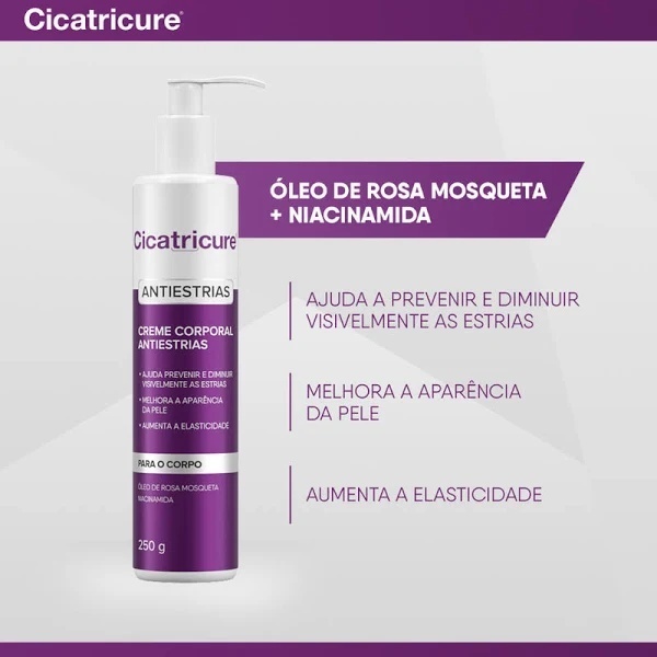Cicatricure Antiestrias - Creme Corporal Poderoso para Reduzir Estrias, Firmar e Hidratar a Sua Pele! Quer recuperar a firmeza, suavizar as estrias e deixar sua pele mais bonita e radiante? O Cicatricure Antiestrias é o aliado perfeito para transformar seu corpo! Com fórmula avançada e comprovada, ele atua de forma eficaz na redução das estrias brancas e vermelhas, além de promover uma pele mais firme, hidratada e com textura irresistível. Resultados Comprovados: 83% das mulheres que usaram em estudo clínico perceberam melhora na firmeza da pele. Reduz visivelmente a aparência das estrias, deixando sua pele mais uniforme e bonita. Modo de Uso Simples e Prático: Aplique após o banho, em todo o corpo ou nas áreas que deseja tonificar, como pernas, abdômen e braços. Massageie suavemente até a completa absorção. Reaplique sempre que desejar uma hidratação extra e maior efeito reafirmante. Benefícios Exclusivos da Fórmula: Óleo de Rosa Mosqueta e Niacinamida: Combinação poderosa que reduz as estrias e melhora a textura da pele desde as primeiras semanas, atuando de forma progressiva e eficaz. Hidratação Profunda: Nutre intensamente, aumenta a elasticidade e deixa a pele macia, sedosa e com aspecto jovem. Importante: A embalagem não indica uso durante gestação ou lactação. Consulte um profissional de saúde antes de usar. Transforme seu corpo com o Cicatricure Antiestrias e sinta a diferença de uma pele mais firme, bonita e livre de estrias!