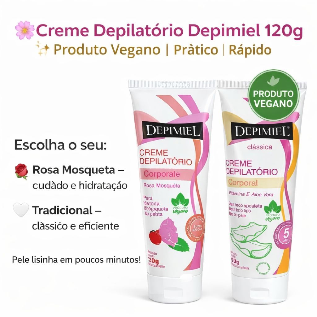 | Creme Corporal Depilatório Rosa Mosqueta 120g Depimiel ou Tradicional este produto | R$ 27,89 | — | 5.0/5 | 2 |