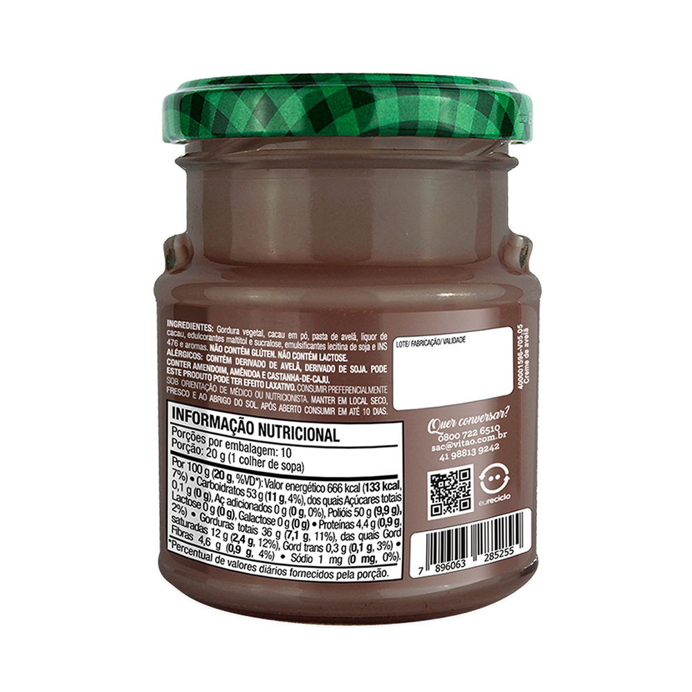 O creme de avelã é a opção saudável que você busca, com sabor irresistível e com menos calorias! Produzido em local exclusivo, sem risco de contaminação com glúten, e adoçado com maltitol e sucralose, ele tem cerca de 20% menos calorias que as versões tradicionais, perfeito para quem busca um doce saudável e equilibrado. Se você busca opções versáteis para suas receitas doces, o creme de avelã é a escolha ideal. Perfeito para panquecas, bolos, torradas e recheios de tortas, ele também combina com frutas ou como cobertura para sobremesas. Com menos calorias, sem açúcar e sem glúten, é uma alternativa saudável que atende a diversas restrições alimentares. Adicione um toque delicioso e nutritivo às suas receitas, sem abrir mão do sabor e da qualidade! INGREDIENTES: Gordura vegetal, cacau em pó, pasta de avelã, liquor de cacau, edulcorantes maltitol e sucralose, emulsificantes lecitina de soja e INS 476 e aromas. ALÉRGICOS: CONTÉM DERIVADO DE AVELÃ, DERIVADO DE SOJA. PODE CONTER AMENDOIM, AMÊNDOA E CASTANHA-DE-CAJU. NÃO CONTÉM GLÚTEN. NÃO CONTÉM LACTOSE. SEM GLÚTEN, ZERO ADIÇÃO DE AÇÚCARES, ZERO LACTOSE, VEGANO.