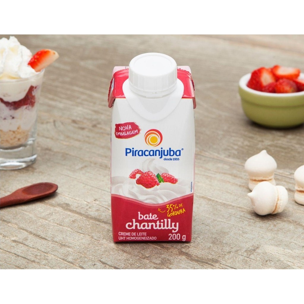 Creme de Leite para Bate Chantilly 200g Piracanjuba - Caixa com 24 O Creme de Leite Piracanjuba para Bate Chantilly é a escolha ideal para quem deseja praticidade e qualidade na hora de preparar sobremesas e coberturas especiais. Desenvolvido especialmente para obter chantilly leve, aerado e consistente, ele garante ótimos resultados tanto para uso doméstico quanto para confeitaria profissional. Com a tradição da Piracanjuba, marca reconhecida pela qualidade de seus laticínios, esse creme de leite é versátil e pode ser usado em diferentes tipos de receitas, proporcionando sabor suave, textura cremosa e excelente rendimento. Principais Características 🥛 Creme de leite especial para bater: desenvolvido para atingir ponto firme de chantilly. 🎂 Versatilidade: ideal para recheios, coberturas, mousses, tortas, bolos e sobremesas em geral. 🍰 Textura cremosa e estável: proporciona chantilly consistente, com ótima fixação e rendimento. ⚡ Praticidade: embalagem de 200g, fácil de armazenar e usar na medida certa. 🌟 Qualidade Piracanjuba: tradição e confiança em cada produto. Modo de Uso Mantenha o creme de leite bem gelado antes de bater. Bata em velocidade média/alta até atingir a consistência desejada. Utilize imediatamente ou conserve refrigerado após o preparo. Informações para Alérgicos Contém leite e derivados. Pode conter traços de soja. Embalagem Peso líquido: 200g. Embalagem longa vida, prática e segura.