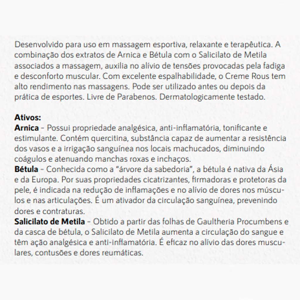 Desenvolvido para uso em massagem esportiva, relaxante e terapêutica. A combinação dos extratos de Arnica e Bétula com o Salicilato de Metila associados a massagem, auxilia no alívio de tensões provocadas pela fadiga e desconforto muscular. Com excelente espalhabilidade, o Arnica Sports Creme tem alto rendimento nas massagens. Pode ser utilizado antes ou depois da prática de esportes. Livre de Parabenos. Dermatologicamente testado. Ativos: Arnica Montana – Analgésica, anti-inflamatória, tonificante e estimulante. Contém quercitina, capaz de aumentar a resistência dos vasos e a irrigação sanguínea nos locais machucados, diminuindo coágulos e atenuando manchas roxas e inchaços Bétula – Propriedades cicatrizantes, firmadoras e protetoras da pele, reduz inflamações e alívia dores nos músculos e nas articulações. É um ativador da circulação sanguínea, prevenindo dores e contraturas. Salicilato de Metila – Aumenta a circulação do sangue e têm ação analgésica e anti-inflamatória. É eficaz no alívio das dores musculares, contusões e dores reumáticas Modo de uso: Aplicar sobre a pele e massagear rapidamente antes da atividade física. Após a atividade, aplicar na pele seca e massagear lentamente para alívio da fadiga muscular. Manter o produto sobre a pele para prolongar sua ação. Precauções/cuidados: Em caso de irritação, suspender o uso imediatamente e procurar orientação médica. O produto não deve ser utilizado por pessoas hipersensíveis a qualquer componente da fórmula. Não aplicar se a pele estiver irritada ou lesionada. Manter ao abrigo da luz e calor excessivos. Produto sujeito a variação de cor, por conter extratos naturais. Manter fora do alcance de crianças. Uso externo. Composição: Aqua, Paraffinum Liquidum, Cetearyl/Sodium Lauryl Sulfate, Phenoxyethanol/ Caprylyl Glycol, Arnica Montana Flower Oil, Betula alba Leaf Extract, Methyl Salicylate, Propylene Glycol, Acrylates/C10-30 Alkyl Acrylate Crosspolymer, BHT, Sodium Hydroxide, Disodium EDTA. Validade: 36 meses Anvisa: 25351.697590/2015-17