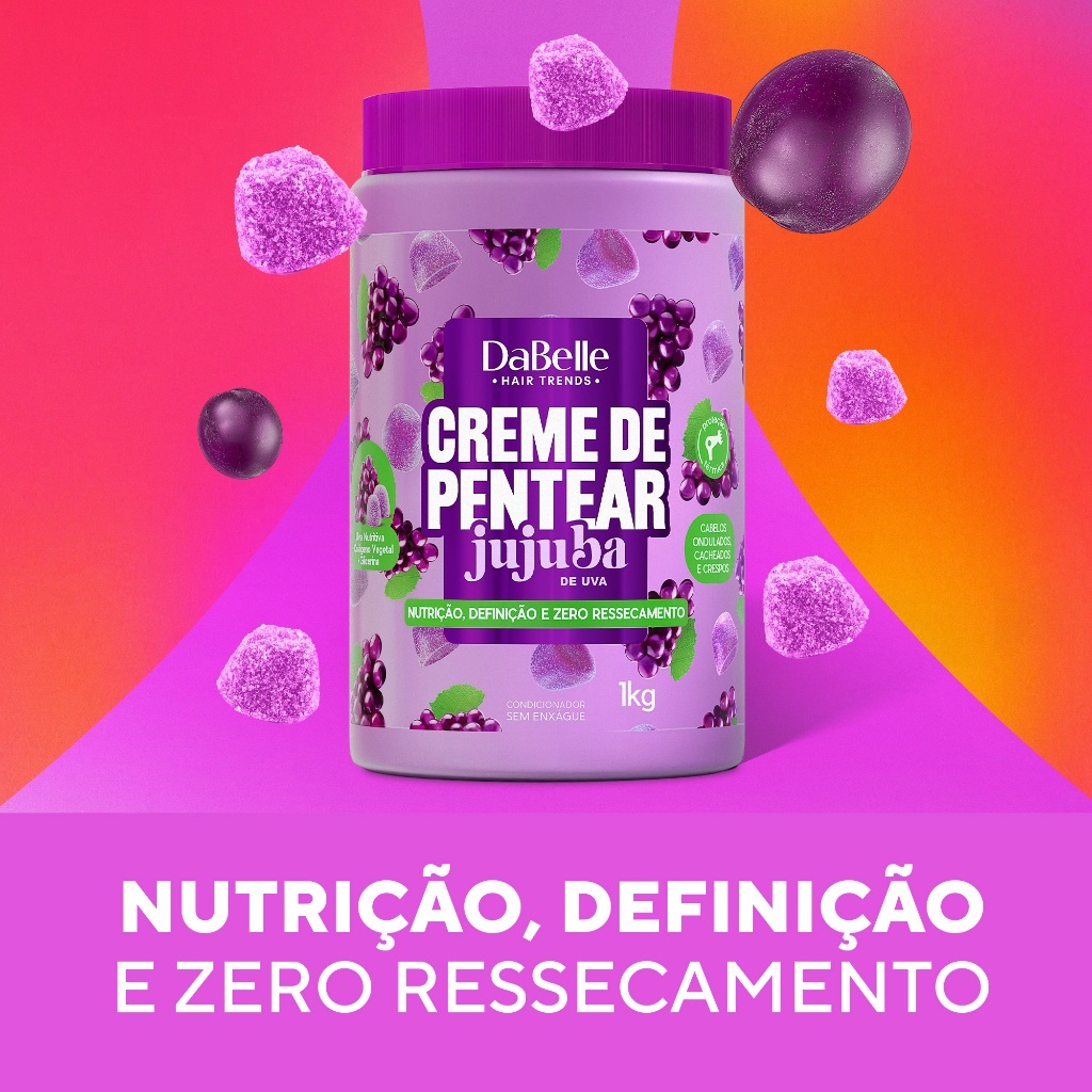 Que tal exibir cabelos super nutridos? O Creme de Pentear Jujuba de Uva 1kg é nutrição umectante na medida certa, ideal para cachos definidos, macios e protegidos o dia todo! Sua fórmula fortalece enquanto desembaraça, combate o ressecamento e mantém os fios alinhados, nutridos e com brilho prolongado. A mistura é liberada: use com a Gelatina Jujuba ou sozinho — de qualquer forma, ele entrega tudo no dia a dia! Com o Complexo Jujuba Definida, proporciona nutrição profunda, definição maleável e toque sedoso sem pesar. O que o Produto Contém Complexo Jujuba Definida: combinação exclusiva para nutrição intensa e definição natural. Uva Nutritiva: Nutrição potente para cachos saudáveis e brilhosos. Protege contra o ressecamento, garante maciez e deixa os fios com definição maleável e duradoura. Colágeno Vegetal + Glicerina: Fortalecem a estrutura dos cachos, mantêm a elasticidade, ajudam a prevenir a quebra e retêm a umidade natural dos fios. Resultado: fios hidratados, resistentes e definidos por muito mais tempo. Benefícios Nutrição Umectante: Reposição de lipídios e brilho prolongado. Cabelos Fortes e Definidos: Fios nutridos e com elasticidade restaurada. Brilho e Maciez: Toque suave e aparência saudável. Proteção Térmica: Ideal para finalizar com difusor ou deixar secar naturalmente. Uso Diário: Textura leve, sem pesar os fios. Embalagem de 1kg: Rendimento prolongado e alto desempenho para várias finalizações. Modo de Uso Usando sozinho: Espalhe nas mãos a quantidade ideal para o seu cabelo. Aplique nos fios úmidos, mecha por mecha. Desembarace com um pente de dentes largos e amasse bem, das pontas até a raiz. Finalize como preferir — com difusor ou secagem natural. Na misturinha: Misture o Creme de Pentear Jujuba de Uva com a sua Gelatina Jujuba favorita (morango, uva, laranja ou melancia). Aplique nos fios úmidos, mecha por mecha. Finalize conforme seu estilo: fitagem, dedoliss ou volume natural. Liberdade total pra você escolher como quer seus cachos hoje!