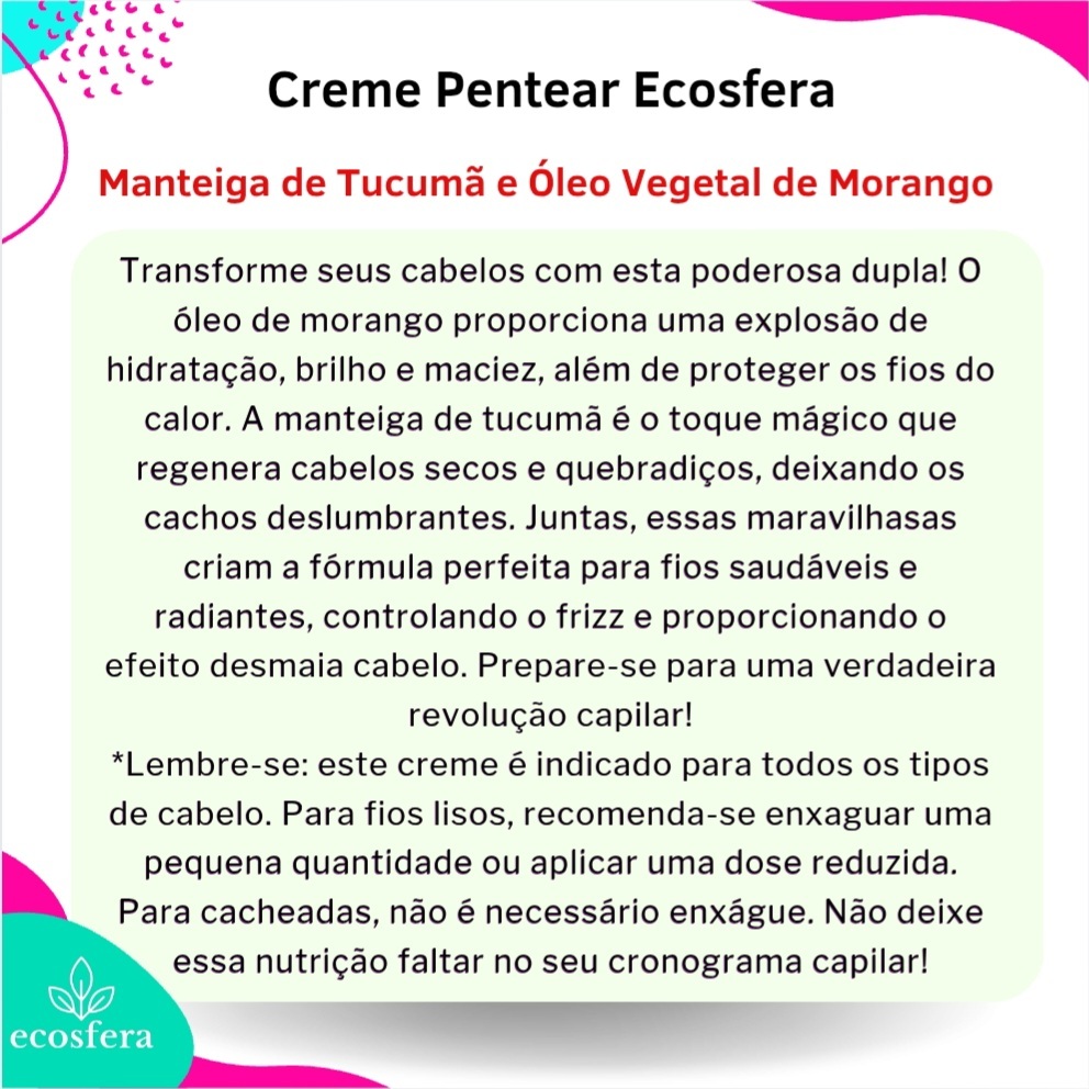 Creme de Pentear Morango e Tucumã! 🍓✨ Fórmula versátil podendo ser utilizado como: Pré-poo Leave-in Máscara Hidratante Creme de Pentear 98% Natural - Vegano e Ecológico 🌎♻️ O óleo de morango, o verdadeiro "rei dos óleos", entra em ação com seu poder ultra hidratante! Ele combate o frizz, protege os fios contra as agressões externas e ainda deixa um cheirinho tão delicioso que você vai querer se sentir o dia todo! Ah, e se você se preocupa com os grisalhos chegando, o morango tem um truque antioxidante que preserva a cor, deixando seus cabelos sempre radiantes e com um brilho incrível! Agora, a manteiga de tucumã... Ah, esse é o toque especial que seu cabelo merece! Ela vai devolver a elasticidade natural dos fios, garantindo força, maciez e sedosidade. Cabelos secos? Nunca mais! O tucumã hidrata profundamente sem pesar e ainda controla volume, combate o frizz e deixa suas pontas intactas, sem aquelas temidas pontas duplas. Quer mais? A manteiga de tucumã é uma aliada dos cachos e das curvas, proporcionando definição perfeita! Para os crespos, e quem está passando pela transição capilar, ela é a salvação, ajudando a restaurar a fibra capilar danificada e estimulando um crescimento saudável e acelerado, graças às vitaminas A, B e C. Nossa formulação possui efeito desmaia cabelo e controle de frizz, proporcionando fios mais definidos, um adeus á cabelos rebeldes! "Existem dois tipos de cabelos: o antes e o depois desse creme! Seus fios ficarão nutridos, radiantes e cheio de vida! Não perca essa transformação e inclua no seu cronograma capilar, sinta a diferença!"✨️🍓🍃 Composição: Base vegana, manteiga de tucumã, óleo vegetal de morango, glicerina vegetal, água destilada, Lanette N, álcool cetoestearílico, pigmento mica, essência, vitamina E, Sharomix. Validade de 10 meses 1 unidade de 600ml Embalagem Ecológica, Reutilizável de Vidro. ECOSFERA.