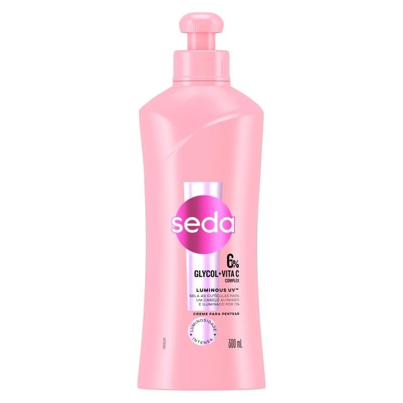 Seda Glycol + Vita C Complex Luminous UV - creme de pentear que repara até 1 ano de danos Creme para Pentear Seda Luminous UV com 6% Glycol + Vita C Complex, cabelo alinhado e iluminado por 72h. Brilhe com o novo Creme para Pentear Seda Luminous UV! Nossa fórmula exclusiva facilita o desembaraço dos fios, repara os sinais de danos causados diariamente pelos raios ultravioleta (UV) e ativa a luminosidade, além de oferecer proteção térmica até 230ºC. Além de oferecer reparação e proteção dos sinais de danos UV, a linha conta com uma fragrância envolvente, uma explosão revigorante de frutas cítricas, criando uma fragrância luminosa e cintilante. Benefícios: - Creme para Pentear Seda LUMINOUS UV para um cabelo alinhado e iluminado por 72h. - Creme para Pentear com 6% GLYCOL+VITA C COMPLEX, sela as cutículas, repara os sinais de danos causados pelos raios UV. - Com fórmula exclusiva, facilita o desembaraço dos fios e repara os sinais de danos causados pelos raios UV. - Creme para Pentear que deixa o cabelo com a aparência mais saudável e ativa a luminosidade. - Use a linha completa Seda LUMINOUS UV para cabelos com brilho e iluminados por mais tempo, um regime completo para todos os tipos de cabelo. - Além de oferecer reparação e proteção dos sinais de danos UV dos cabelos, a linha conta com uma fragrância envolvente e revigorante de frutas cítricas, criando uma fragrância luminosa e cintilante. Fórmula enriquecida com: - Proteção térmica 230° C - Vita C, conhecida por potencializar o brilho - Glycol, que melhora o alinhamento e a reflexão da luz nos fios - Sela as cutículas - Cabelo alinhado e iluminado por 72 horas. Como usar o Creme de Pentear Seda Luminous UV? Aplique sobre o cabelo úmido, não necessita de enxágue. Pentear e dar forma como de costume. Cabelos com brilho e iluminados por mais tempo com a linha completa Seda Luminous UV. Use a linha completa Seda Luminous UV para cabelos com brilho e iluminados por mais tempo, um regime completo para todos os tipos de cabelo. Cabelos oleosos e mistos podem usar creme de pentear? Sim, é possível usar creme de pentear em cabelos oleosos e mistos, mas é importante ter alguns cuidados: - Quantidade: use a quantidade correta, principalmente se o cabelo for fino. - Fórmula: prefira cremes com fórmula leve e fluida. Cremes com óleo de côco, por exemplo, podem deixar os fios pesados. - Aplicação: não aplique o creme no couro cabeludo, apenas no comprimento e nas pontas. - Finalizadores: use óleos de textura leve, que hidratam sem pesar. Se o produto tiver protetor térmico, melhor ainda. Para cabelos mistos, também é possível usar um leave-in que reduza a oleosidade e o frizz, e proteja do sol. Para lavar cabelos mistos, é recomendado lavar em dias alternados. Realce a beleza dos seus cabelos com Seda Glycol Luminous! Encontre a nova linha de Seda aqui na e dê aos seus fios o cuidado que eles merecem!