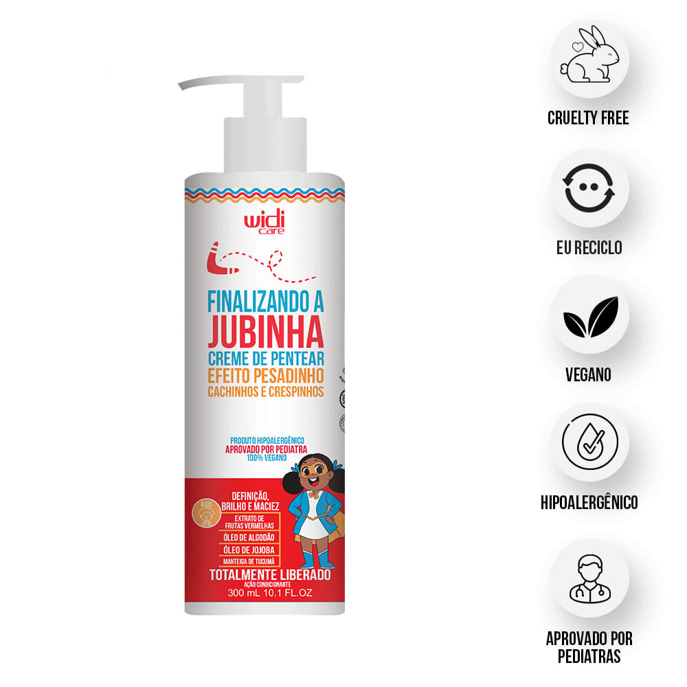 O Creme De Pentear Widi Care Finalizando Jubinha Efeito Pesadinho 300ml foi desenvolvido para auxiliar na hidratação e definição de todos os fios, especialmente cacheados e crespos, transformando esses cabelinhos em jubinhas poderosas. Sua fórmula contém extrato de frutas vermelhas, óleo de algodão, óleo de jojoba e manteiga de tucumã. Todos esses ativos proporcionam condicionamento, brilho, maciez, sedosidade. Produto hipoalergênico e dermatologicamente testado, com proteção térmica e filtro solar. Benefícios: - Cabelos definidos; - Promove condicionamento; - Proteção térmica e filtro solar; - Brilho e maciez. Modo de usar: Divida o cabelo ainda úmido em mechas finas, coloque uma quantidade suficiente do creme nas mãos e aplique fazendo fitas. Repita esse processo por todo o cabelo e depois modele as mechas de baixo para cima para ajudar na definição. Deixe secar naturalmente ou com ajuda de um difusor. Sobre a marca: A marca Widi Care saiu dos salões cariocas para chegar ao conforto das casas! Há mais de 10 anos no segmento de cosméticos capilares em todo o Brasil, a marca começou atendendo profissionais de salões de beleza e chegou às casas das consumidoras com sua linha home care.