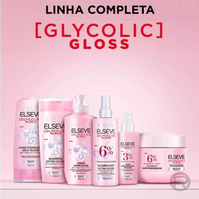 A linha Elseve Glycolic Gloss de L’Oréal Paris garante 3X mais gloss que resiste a 6 lavagens. Sua fórmula com pH Ácido rica em Ácido Glicólico, combate a porosidade e sela as cutículas para revelar um cabelo visivelmente saudável e alinhado para um brilho gloss. Cabelo poroso e sem brilho? Nosso Tratamento Condicionante Antiporosidade, com pH ácido e 6% [Complexo com Acido Glicólicol, restaura intensamente os fios, preenche as falhas e sela a fibra para um cabelo visivelmente transtormado, macio e saudável com gloss espelhado. *Teste instrumental, uso de Creme de Tratamento L'Oréal Paris Elseve Glycolic Gloss vs shampoo clássico.