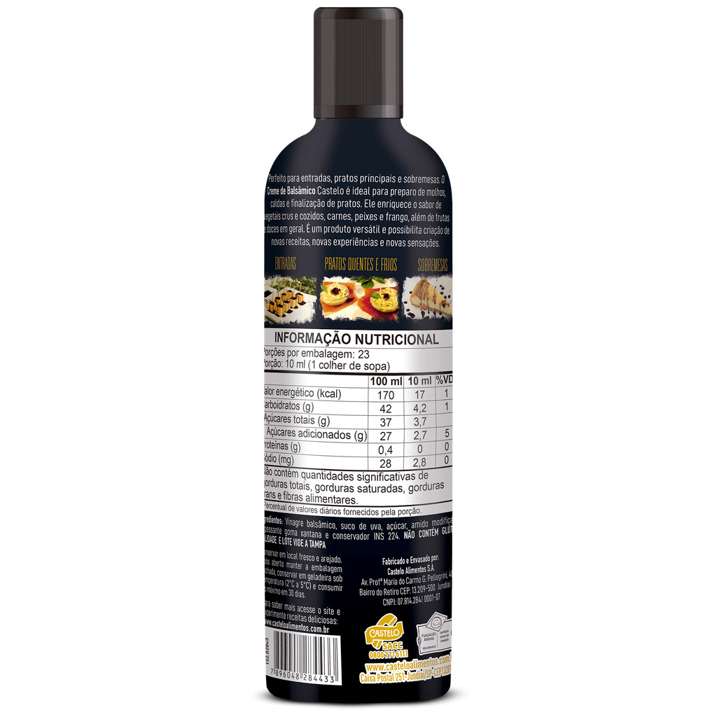 Creme de Vinagre Balsâmico Tradicional - Castelo - 270g Com embalagem moderna, o Creme de Vinagre Balsâmico Castelo está totalmente reformulado. Elaborado a partir da redução do Vinagre Balsâmico, conta com uma nova receita, com concentração maior de suco de uva. Mais encorpado e com sabor frutado marcante. Outra novidade é o bico dosador com diâmetro menor, para dar melhor finalização aos pratos. O Creme de Vinagre Balsâmico Castelo é produzido pelo processo de fermentação natural do vinho tinto, com adição de extrato de madeiras nobres. Ideal para o preparo de molhos, caldas e finalização de pratos. Ingredientes: Vinagre balsâmico, suco de uva, açúcar, amido modificado, espessante goma xantana e conservante INS 224.