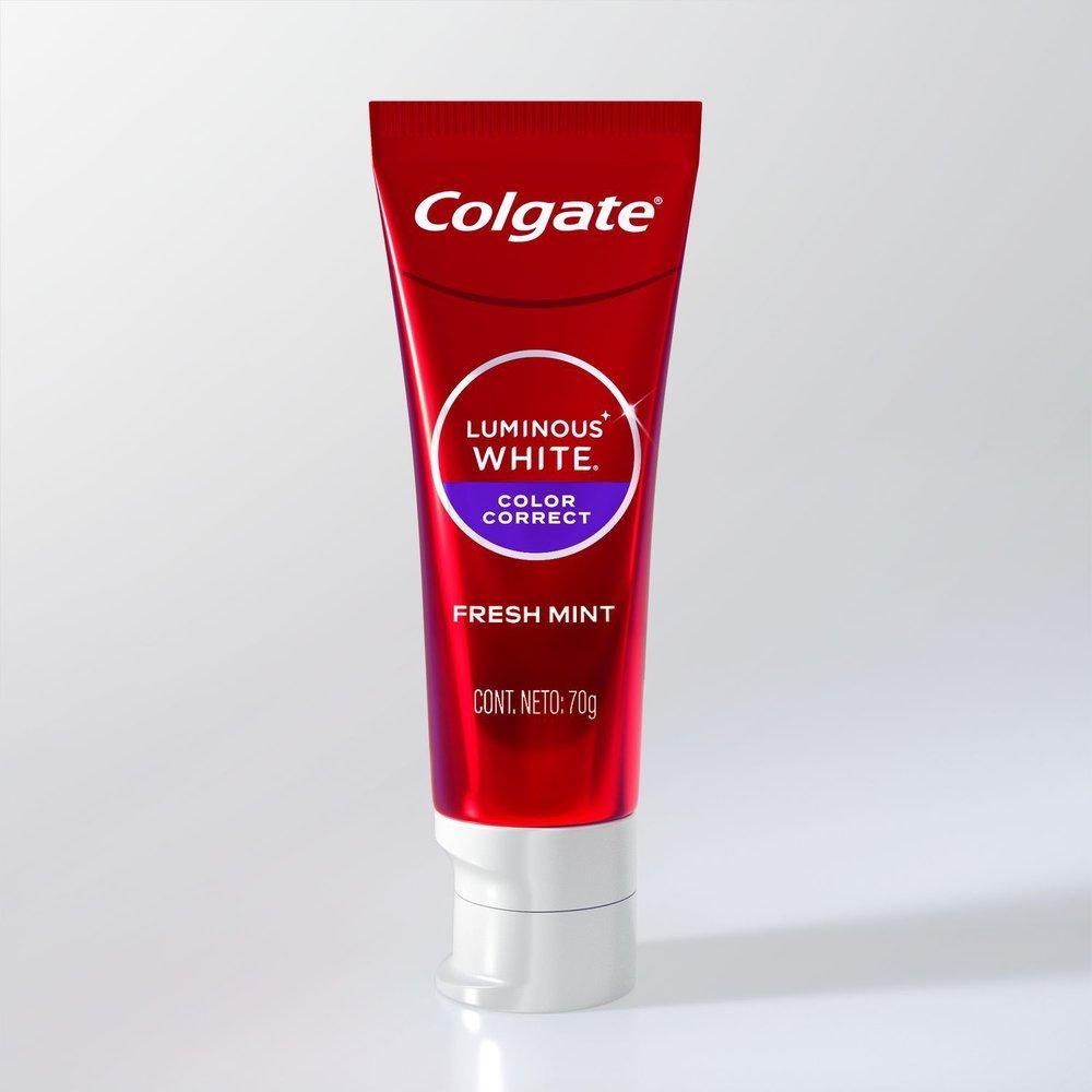 Com o creme dental Colgate Luminous White Color Correct obtém dentes mais brancos com sua fórmula corrige instantaneamente tons amarelados¹ e manchas nos dentes. Agindo como um clareador dental superior que protege o esmalte dos dentes sem danificar, graças à sua tecnologia de corante violeta, com efeito, clareador temporário e fácil de usar. ¹O efeito temporario.