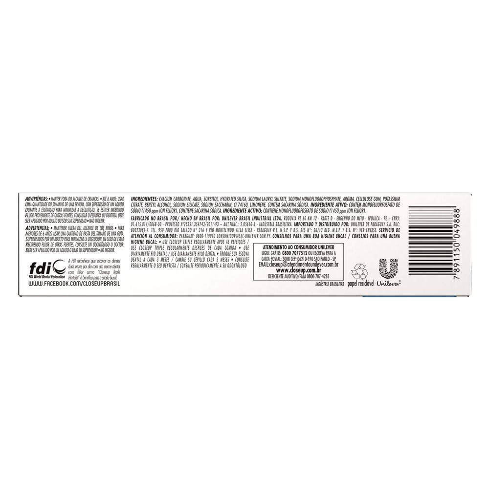 • O Creme Dental Closeup Tripla Proteção Hortelã proporciona dentes 10x mais fortes • Sua fórmula possui tripla proteção: anticáries, dentes brancos e hálito fresco • O flúor bioativo previne às cárie