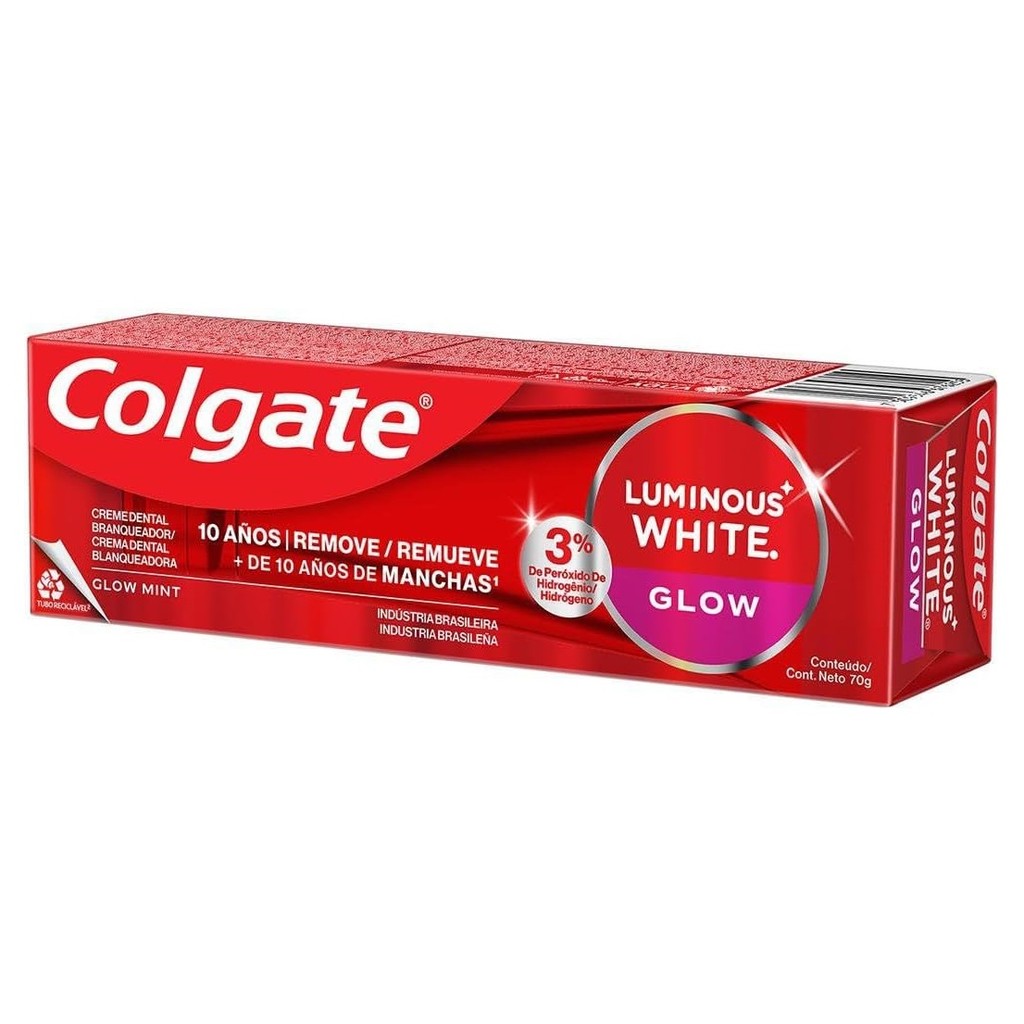 Creme Dental Colgate Luminous White Glow 70g O creme dental Colgate Luminous White Glow é perfeito para clarear os dentes em casa. Ele ajuda a remover mais de 10 anos de manchas, com resultados depois de 4 semanas, com uso diário. Sua fórmula contém peróxido de hidrogênio a 3%, ingrediente utilizado por dentistas, que não danifica o esmalte dentário e deixa os dentes visivelmente mais brancos. Além de deixar os dentes mais brancos com uso diário, o creme dental Luminous White Glow da Colgate contém flúor que ajuda a proteger contra cáries e possui um sabor refrescante de menta que refresca o hálito. Benefícios e diferenciais da pasta de dente Colgate Luminous White Glow Perfeito para clarear os dentes em casa. Desenvolvido para não causar sensibilidade dental. Ajuda a remover mais de 10 anos de manchas. Resultados depois de 4 semanas, com uso diário. Fórmula com peróxido de hidrogênio a 3%, ingrediente utilizado por dentistas. Fórmula que não danifica o esmalte dentário. Contém flúor que ajuda a proteger contra cáries. Sabor refrescante de menta que refresca o hálito. Pode ser usado diariamente. Eficácia clinicamente comprovada. Tubo reciclável. Informações de segurança Não se deve engolir. Em caso de ingestão, procurar atendimento médico imediatamente e mostrar o rótulo ou a embalagem. Mantenha fora do alcance de crianças. Evite o contato com os olhos e a pele. Lave as mãos imediatamente após o uso. Instruções Escove os dentes cuidadosamente com o creme dental Colgate Luminous White Glow após cada refeição e por pelo menos dois minutos. Se você sentir uma sensação de calor na boca enquanto escova os dentes com o creme dental clareador Colgate Luminous White Glow, isso significa que o peróxido de hidrogênio está clareando seus dentes. Escorra bem após escovar os dentes.