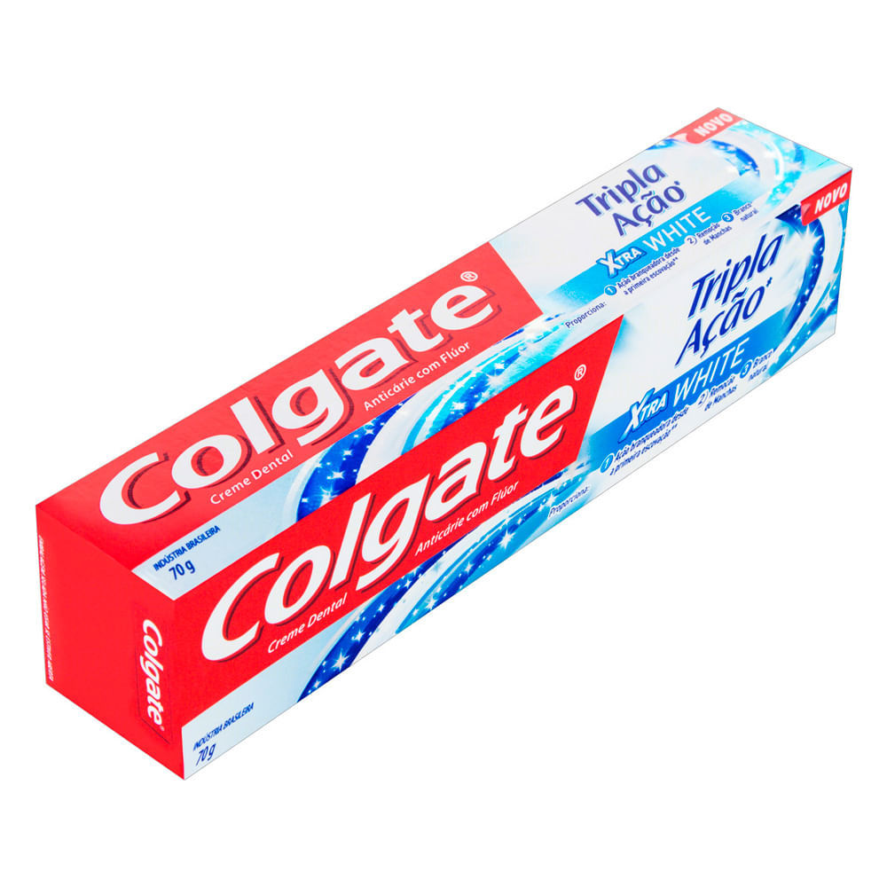 Creme Dental Colgate Tripla Ação Xtra White 70g A pasta de dente Colgate Tripla Ação Xtra White, oferece tripla proteção para a sua família com ação branqueadora desde a primeira escovação. Benefí