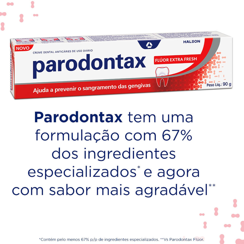 Creme Dental Parodontax Flúor Extra Fresh 90g Creme Dental Parodontax Flúor ajuda a prevenir o sangramento das gengivas.4x mais eficaz na remoção da causa do sangramento da gengiva.Na remoção da placa
