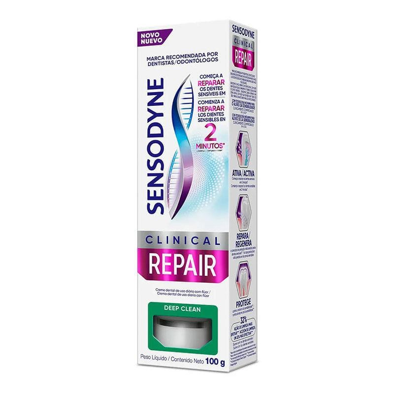 Creme Dental Sensodyne Clinical Repair - Alívio da Sensibilidade e Reparação do Esmalte O Creme Dental Sensodyne Clinical Repair foi desenvolvido para proporcionar uma solução avançada no combate à sensibilidade dentária, oferecendo reparação efetiva ao esmalte dos dentes. Ideal para quem busca aliviar o desconforto ao consumir alimentos e bebidas quentes, frias, doces ou ácidas, além de reforçar a estrutura dental. Sensodyne Creme Dental Clinical Repair Limpeza Profunda, Creme Dental para Dentes Densíveis, começa reparar os dentes sensíveis em 2 minutos*com tecnologia Novamin para o alívio da sensibilidade clinicamente comprovado em 14 dias. Ação de limpeza 32% mais efetiva, gentil com os dentes sensíveis, proporciona alívio duradouro da sensibilidade e ajuda a prevenir o retorno da dor. Benefícios do Creme Dental Sensodyne Clinical Repair - Alívio Rápido e Duradouro da Sensibilidade: Com ação comprovada, o Sensodyne Clinical Repair age nas áreas sensíveis dos dentes, aliviando o desconforto de forma prolongada. - Reparação do Esmalte Dental: Sua fórmula contém compostos minerais que ajudam a restaurar o esmalte danificado, reforçando a proteção contra desgastes e erosão. - Proteção Contra a Cárie: O flúor presente na composição protege contra o aparecimento de cáries e ajuda a manter a saúde bucal. - Fortalece e Remineraliza: Promove a remineralização dos dentes, restaurando a estrutura do esmalte e ajudando a proteger contra danos futuros. Como Usar o Sensodyne Clinical Repair? Para melhores resultados, use o Sensodyne Clinical Repair duas vezes ao dia. Aplique uma quantidade pequena na escova e escove os dentes por pelo menos 2 minutos, utilizando movimentos suaves e circulares. Evite enxaguar a boca com muita água após a escovação, para prolongar a ação dos ingredientes ativos nos dentes. Diferenciais do Creme Dental Sensodyne Clinical Repair - Tecnologia NovaMin: Sensodyne Clinical Repair é formulado com a tecnologia NovaMin, que libera minerais para as áreas fragilizadas dos dentes, ajudando a restaurar o esmalte e reduzir a sensibilidade. - Ação Direcionada: A fórmula foi desenvolvida para agir diretamente nos dentes sensíveis, oferecendo uma camada protetora contra estímulos externos. - Indicado para Uso Diário: É seguro para uso contínuo, promovendo benefícios a longo prazo para quem sofre de sensibilidade e desgaste do esmalte. - Recomendado por Dentistas: Clínicos e dentistas recomendam Sensodyne Clinical Repair para quem busca alívio eficaz da sensibilidade e reparação do esmalte. Principal Ativo do Sensodyne Clinical Repair O ativo principal do Creme Dental Sensodyne Clinical Repair é o NovaMin, uma tecnologia que libera cálcio e fosfato sobre a superfície do dente, formando uma camada protetora nas áreas danificadas. Esse processo contribui para a reparação do esmalte e cria uma barreira contra estímulos dolorosos, promovendo um alívio efetivo da sensibilidade. Adquira na a Creme dental Sensodyne Clinical Repair que proporcionando uma limpaza e proteção em dentes sensíveis.